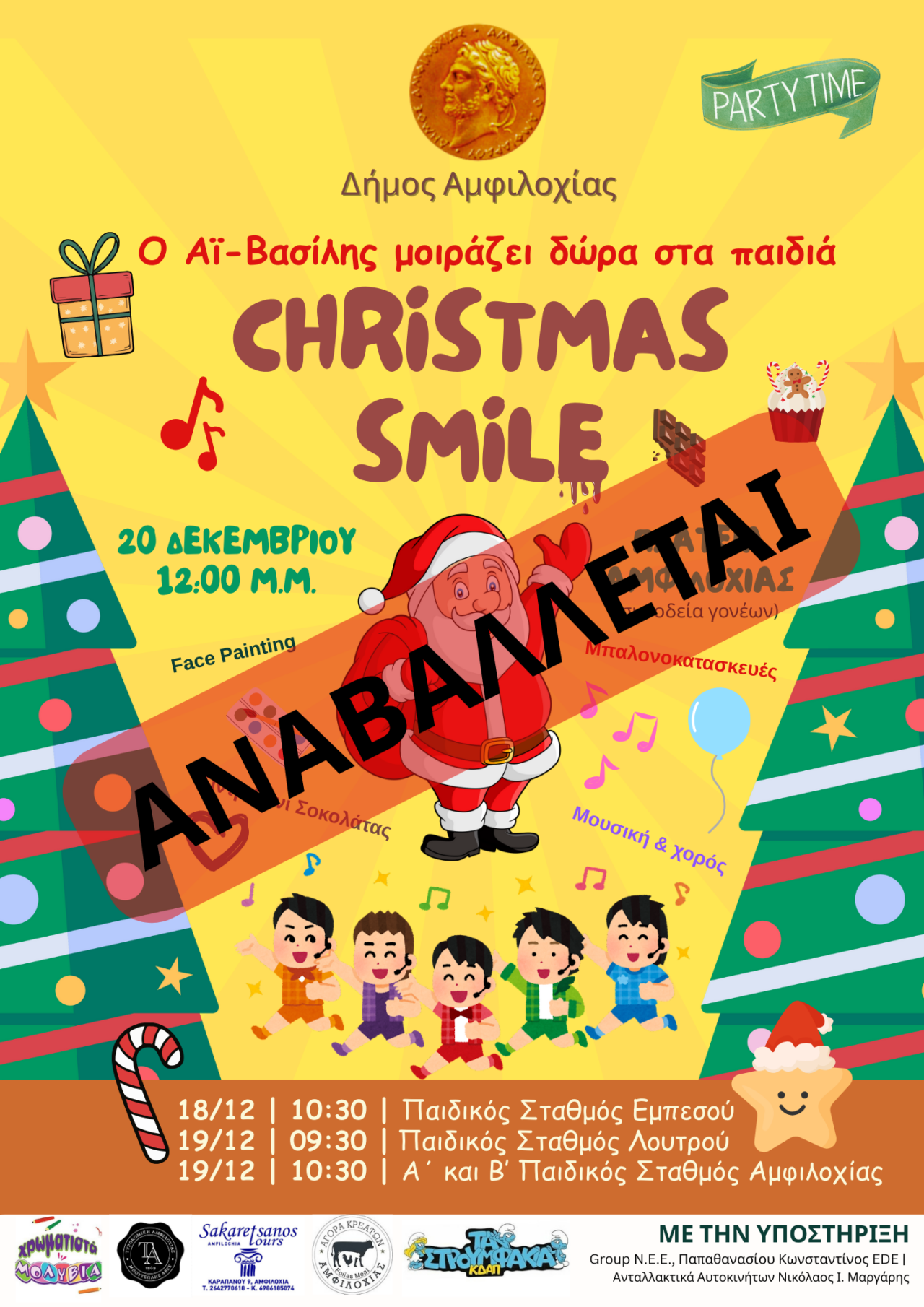 Αναβάλλεται λόγω του αιφνίδιου θανάτου του συμπολίτη μας Αποστόλη Σταφυλά που έχει βυθίσει στο πένθος την τοπική μας κοινωνία, η σημερινή χριστουγεννιάτικη γιορτή για τα παιδιά «Christmas Smile» που ήταν προγραμματισμένη τις 12:00 στην κεντρική πλατεία Αμφιλοχίας.