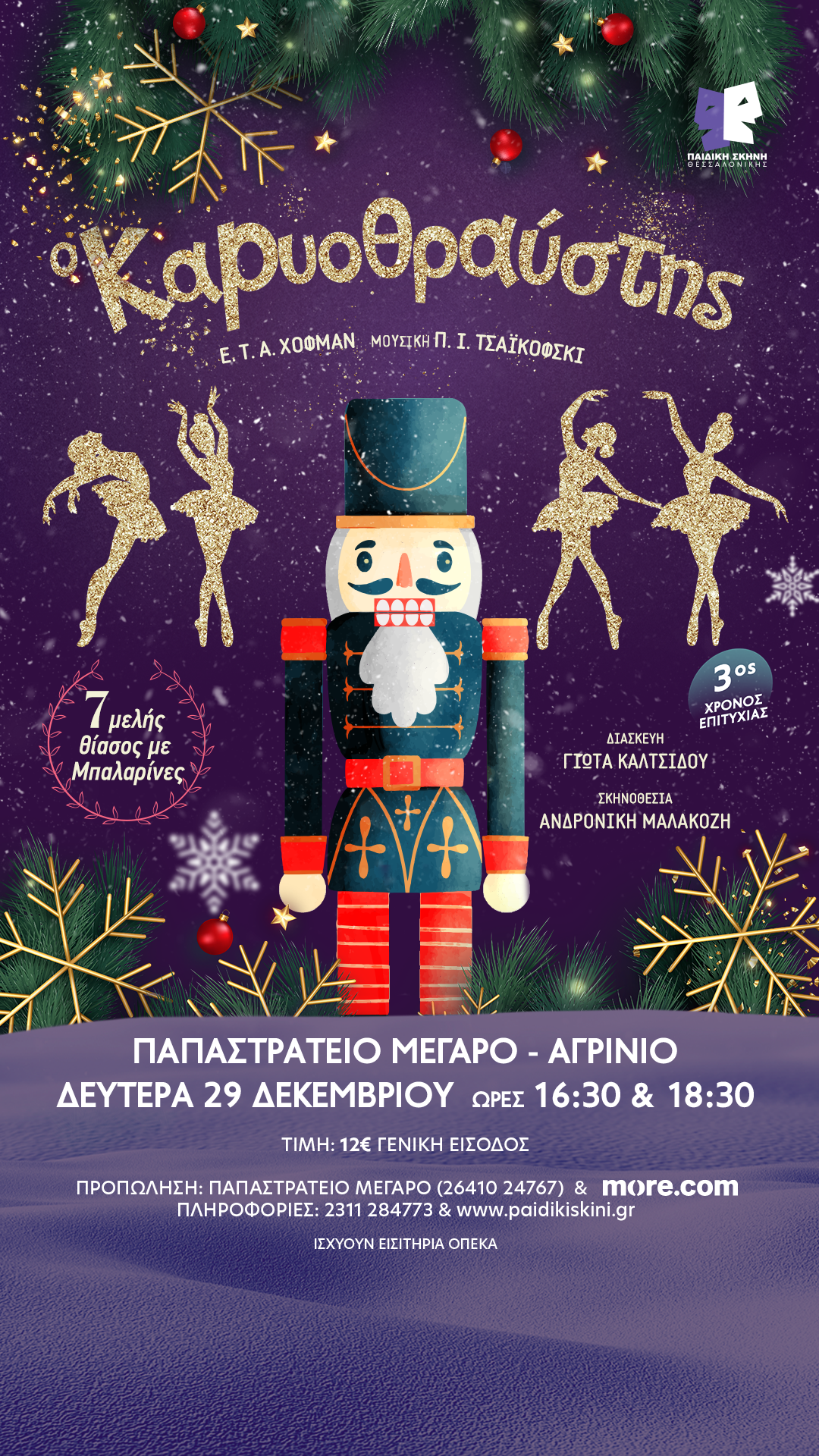 Η Παιδική Σκηνή Θεσσαλονίκης παρουσιάζει στο Αγρίνιο την ωραιότερη χριστουγεννιάτικη ιστορία, «Ο Καρυοθραύστης», του Γερμανού Έρνεστ Τέοντορ Αμαντέους Χόφμαν, με επτά ηθοποιούς και χορευτές επί σκηνής και σε μουσική Τσαϊκόφσκι, στο Παπαστράτειο Μέγαρο!