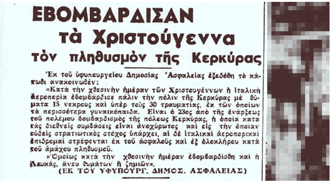 Τα Χριστούγεννα του 1940 η ιταλική αεροπορία βομβαρδίζει την πόλη της Κέρκυρας και την Λευκάδα.
