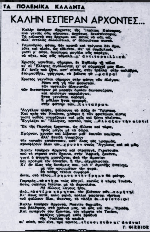 Και τα πολεμικά κάλαντα του Γιώργου Θίσβιου, όπως δημοσιεύτηκαν στην εφημερίδα «Ακρόπολις» της Τετάρτης 25 Δεκεμβρίου 1940.