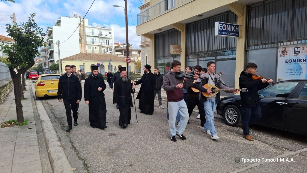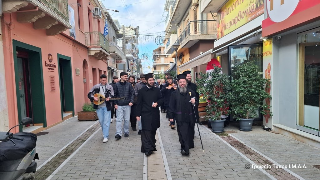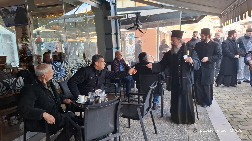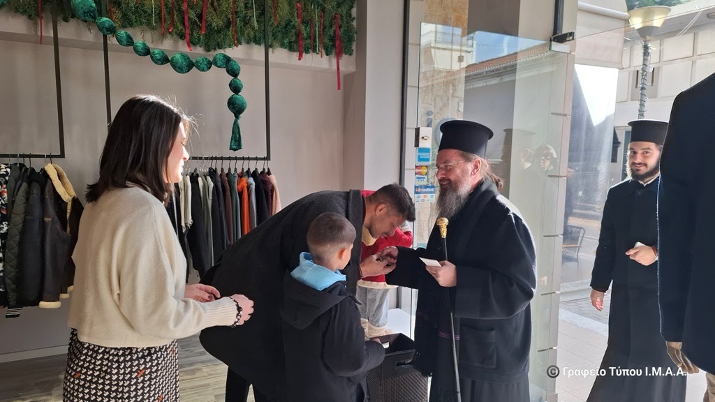 Μετά την Θεία Λειτουργία ο Μητροπολίτης κ. Δαμασκηνός, συνοδευόμενος από τα στελέχη των κατασκηνωτικών περιόδων αγοριών Γυμνασίου και Λυκείου της Ιεράς Μητροπόλεως, μαζί με τον Αρχηγό των περιόδων αυτών, Αρχιμ. Βασίλειο Αγγελάκη, επισκέφθηκαν το εμπορικό κέντρο της Ιεράς Πόλεως. Ο Σεβασμιώτατος ευχήθηκε χρόνια πολλά στους ιδιοκτήτες των καταστημάτων, τους κατοίκους και τους επισκέπτες της Ιεράς Πόλεως, συνομίλησε μαζί τους και διένειμε σε όλους ως ευλογία την εικόνα της Γεννήσεως του Χριστού, ενώ οι νέοι τραγουδούσαν χριστουγεννιάτικα τραγούδια και έψαλλαν κάλαντα, με τη συνοδεία παραδοσιακών μουσικών οργάνων.