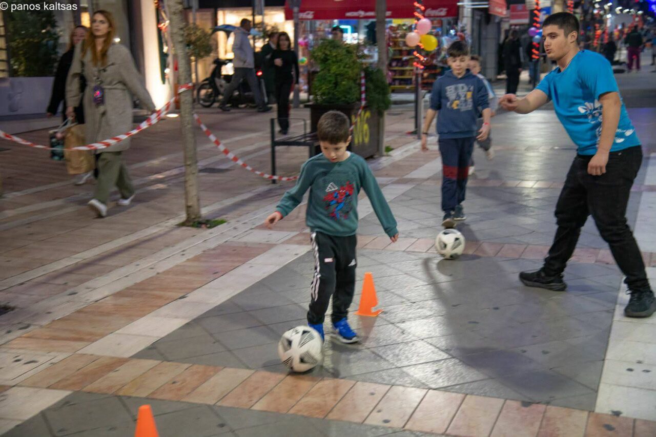 Τα παιδιά των μικρών αθλητών έριξαν “σουτάκια” σε τέρμα που είχε στηθεί σε κεντρική οδό, περνώντας τους κώνους με τη μπάλα, υπό τις οδηγίες του προπονητή Βασίλη Πανταζή.