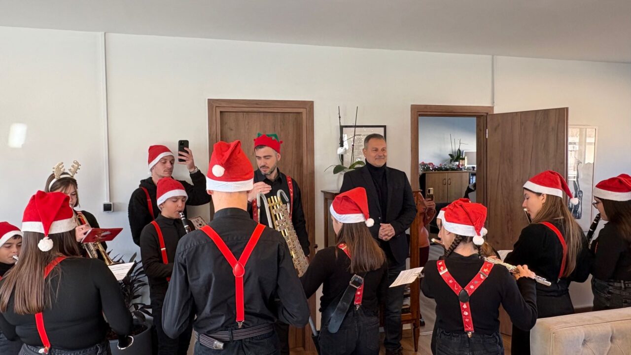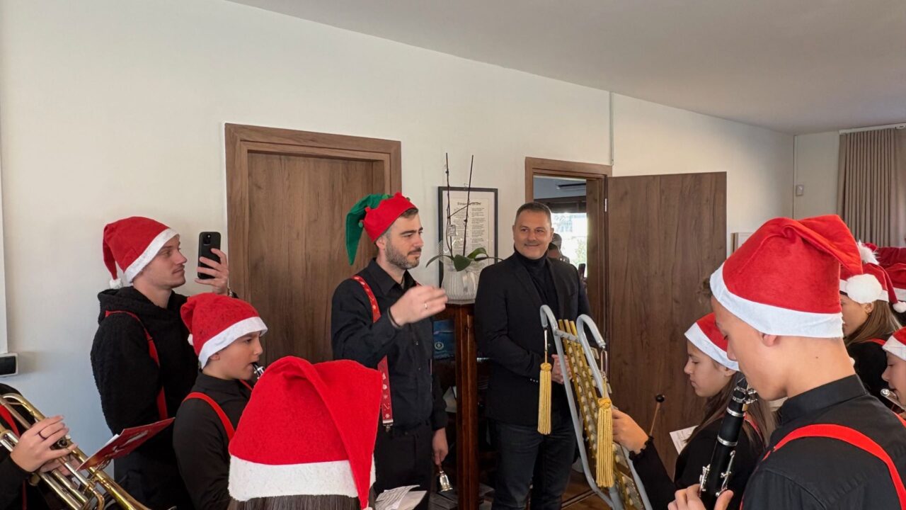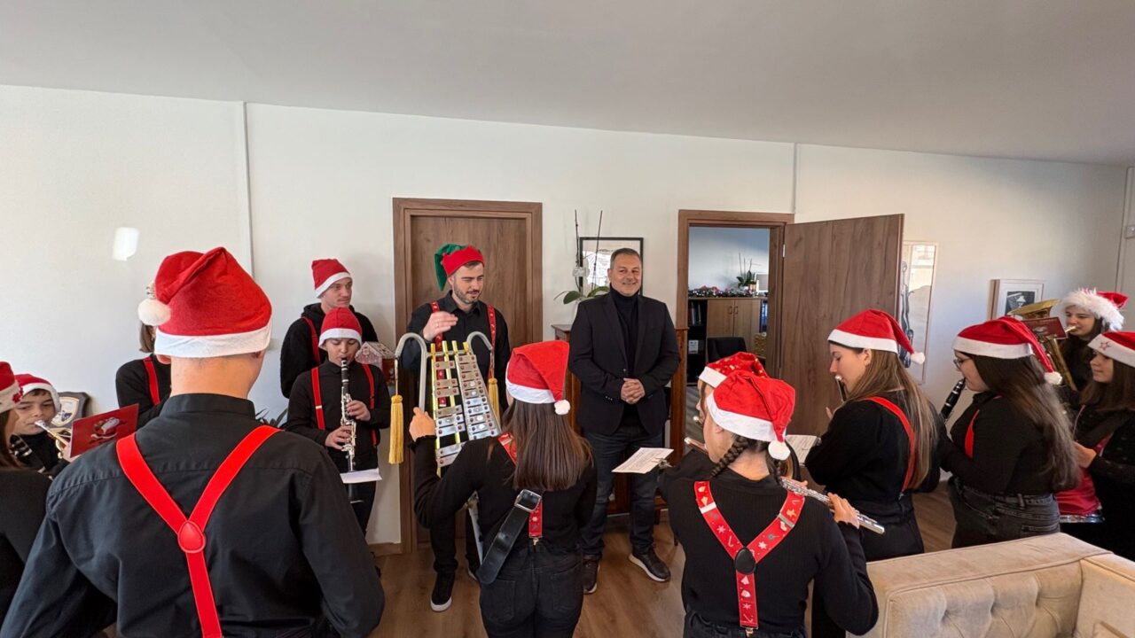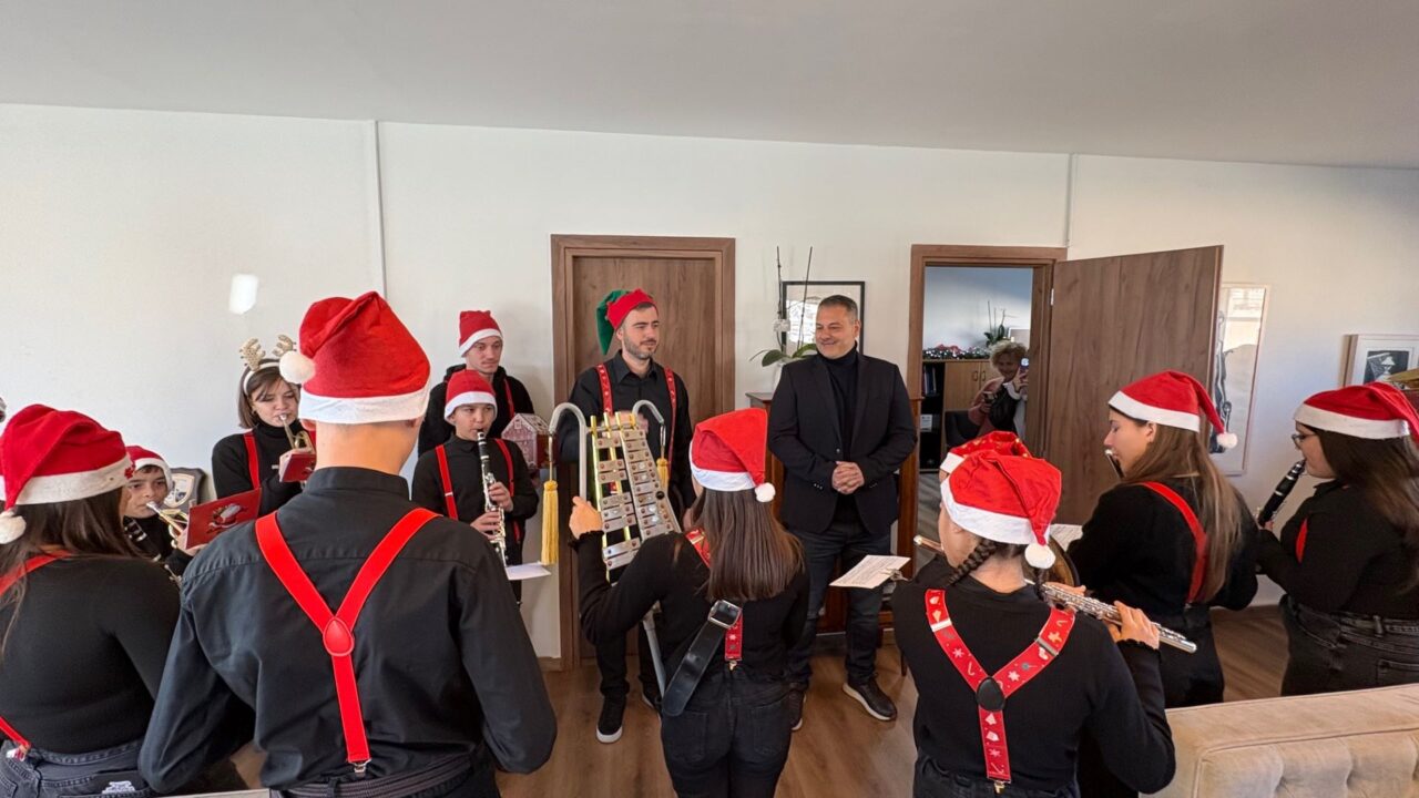 Στη συνέχεια, η Φιλαρμονική συνέχισε στους χώρους των δημοτικών υπηρεσιών, λέγοντας τα κάλαντα στους εργαζόμενους του Δημαρχείου και μεταφέροντας το εορταστικό κλίμα σε όλο το κτήριο.