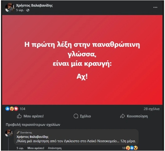 Πριν από περίπου πέντε ώρες, ο ηθοποιός προχώρησε σε νέα ανάρτηση, δημοσιεύοντας ένα λιτό μήνυμα με τη φράση: «Η πρώτη λέξη στην πανανθρώπινη γλώσσα, είναι μια κραυγή: Αχ!», συνοδεύοντάς τη με σχόλιο στο οποίο αναφέρει ότι πρόκειται για ανάρτηση «από τον εγκλεισμό στο Λαϊκό Νοσοκομείο… 12η μέρα».