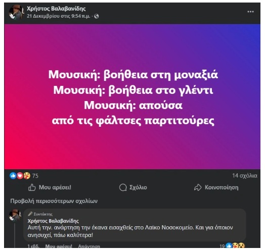 Στην ανάρτηση που έκανε πριν από δύο μέρες, ο Χρήστος Βαλαβανίδης είχε παραθέσει έναν σύντομο διάλογο με φιλοσοφικό χαρακτήρα, χωρίς ωστόσο να δώσει περισσότερες πληροφορίες για το πρόβλημα υγείας που αντιμετωπίζει.