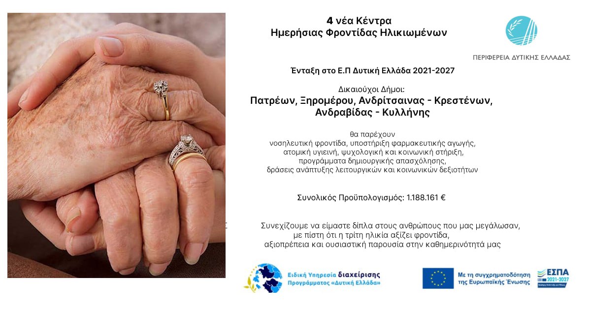 Προχωρήσαμε στην ένταξη πράξεων στο Ε.Π. Δυτική Ελλάδα 2021-2027, προκειμένου να δημιουργηθούν 4 Νέα Κέντρα Ημερήσιας Φροντίδας Ηλικιωμένων, στους Δήμους Πατρέων, Ξηρομέρου, Ανδρίτσαινας – Κρεστένων, Ανδραβίδας – Κυλλήνης, με συνολικό προϋπολογισμό 1.188.161 ευρώ.