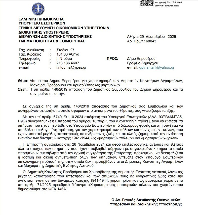 Η αρμόδια Επιτροπή συνεδρίαση και απέρριψε εκ νέου το αίτημα μας για τις Κοινότητες Μαχαιράς και Αγραμπέλου. Επισυνάπτεται το σχετικό επίσημο έγγραφο υπ’ αριθμόν πρωτ. 68043/29-12-2025 που απεστάλλει στον Δήμο Ξηρομέρου.