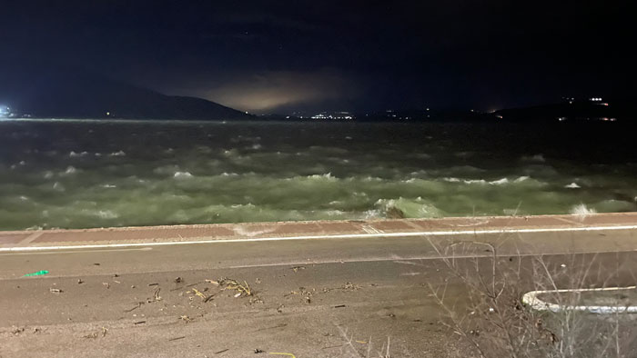 Το νερό κάλυψε τμήματα της παραλιακής οδού, δυσχεραίνοντας την κυκλοφορία οχημάτων και πεζών, ενώ σε αρκετά σημεία παρατηρήθηκαν φερτά υλικά και συσσώρευση υδάτων. Οι εικόνες που καταγράφονται θυμίζουν περισσότερο χειμερινή θαλασσοταραχή ανοιχτού πελάγους παρά κλειστό κόλπο, γεγονός που αποτυπώνει τη σφοδρότητα των καιρικών συνθηκών.