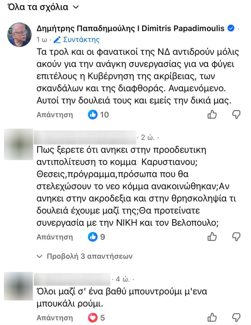 Απαντώντας, μάλιστα, στις αντιδράσεις κάτω από την ανάρτησή του στο Facebook, τις αποδίδει συλλήβδην σε… τρολ. «Τα τρολ και οι φανατικοί της ΝΔ αντιδρούν μόλις ακούν για την ανάγκη συνεργασίας για να φύγει επιτέλους η Κυβέρνηση της ακρίβειας, των σκανδάλων και της διαφθοράς. Αναμενόμενο. Αυτοί την δουλειά τους και εμείς την δικιά μας» γράφει χαρακτηριστικά.