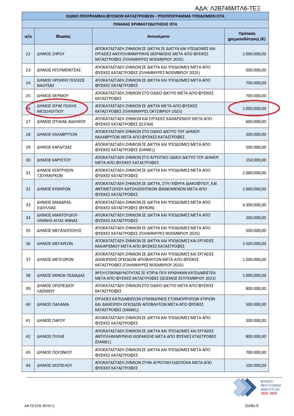 Τη χρηματοδότηση ύψους 2.000.000 ευρώ εξασφάλισε ο Δήμος Ιερής Πόλης Μεσολογγίου για την υλοποίηση παρεμβάσεων αντιπλημμυρικής προστασίας, με στόχο την αντιμετώπιση των πλημμυρικών φαινομένων που ταλαιπωρούν διαχρονικά την περιοχή.