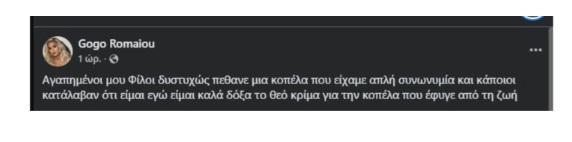 «Αγαπημένοι μου Φίλοι δυστυχώς πέθανε μια κοπέλα που είχαμε απλή συνωνυμία και κάποιοι κατάλαβαν ότι είμαι εγώ είμαι καλά δόξα τω Θεώ, κρίμα για την κοπέλα που έφυγε από τη ζωή».