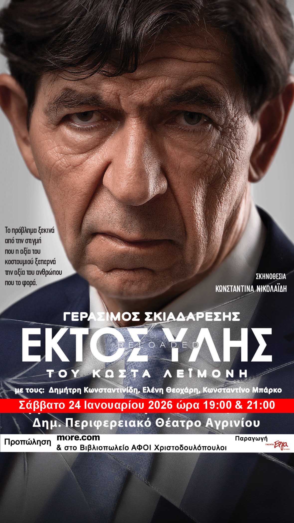 Στο ΔΗ.ΠΕ.ΘΕ. Αγρινίου ο Γεράσιμος Σκιαδαρέσης με το βραβευμένο έργο «Εκτός Ύλης reloaded» του Κώστα Λεϊμονή, το Σάββατο 24 Ιανουαρίου 2026, ώρα 19: 00 & 21:00.