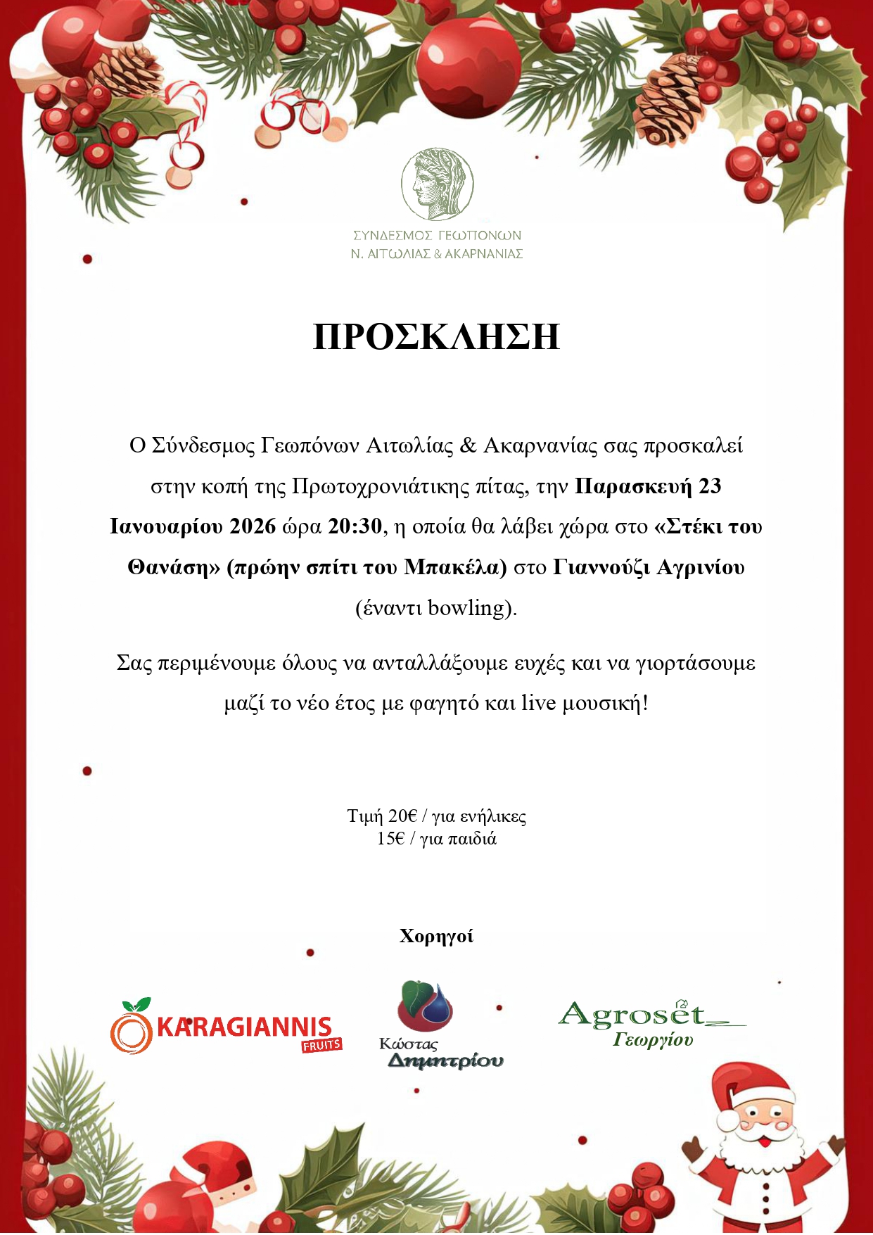 Ο Σύνδεσμος Γεωπόνων Αιτωλίας & Ακαρνανίας σας προσκαλεί στην κοπή της Πρωτοχρονιάτικης πίτας, την Παρασκευή 23 Ιανουαρίου 2026 ώρα 20:30, η οποία θα λάβει χώρα στο «Στέκι του Θανάση» (πρώην σπίτι του Μπακέλα) στο Γιαννούζι Αγρινίου (έναντι bowling).