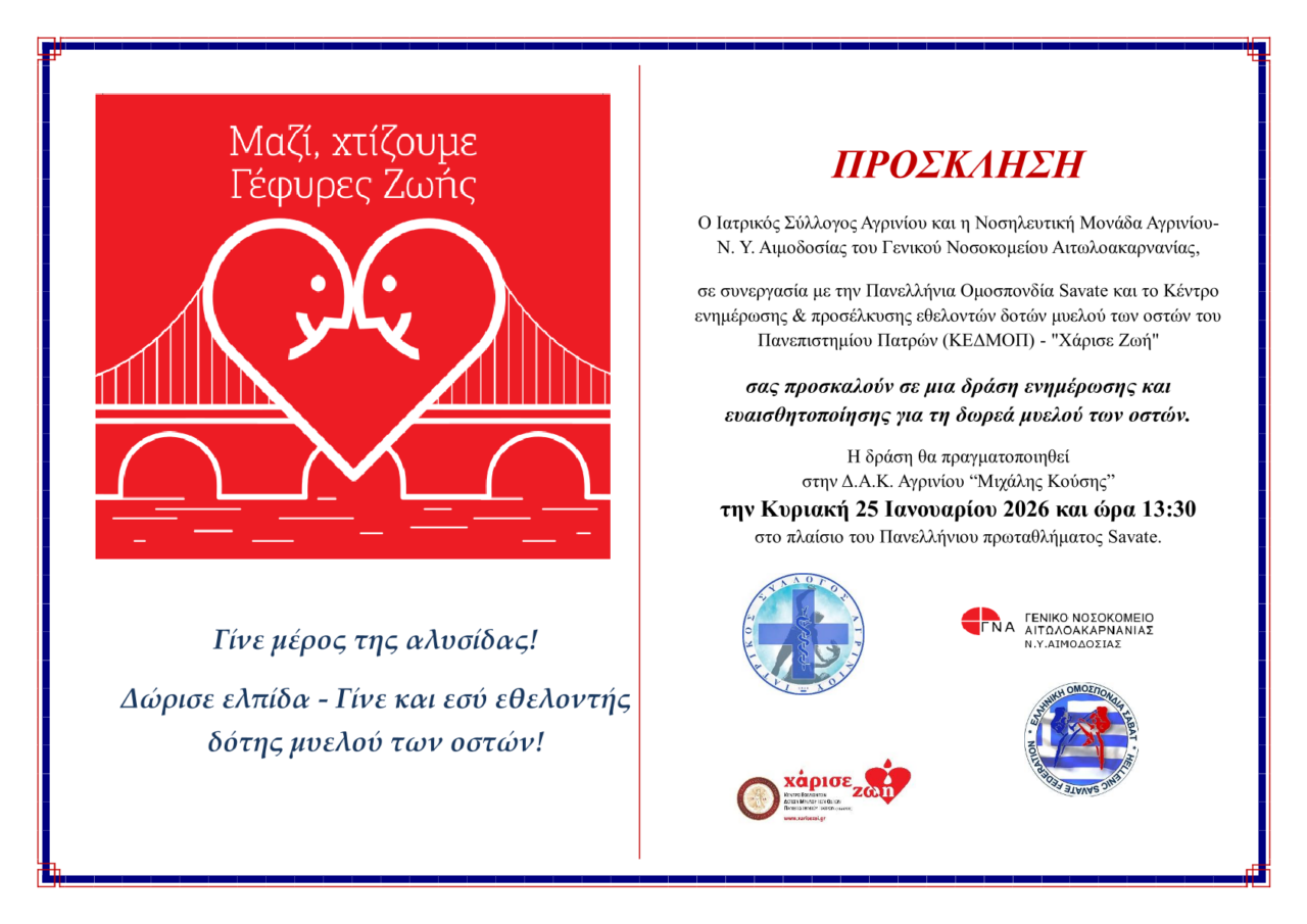 Ο Ιατρικός Σύλλογος Αγρινίου και η Νοσηλευτική Μονάδα Αγρινίου- Ν. Υ. Αιμοδοσίας του Γενικού Νοσοκομείου Αιτωλοακαρνανίας, σε συνεργασία με την Πανελλήνια Ομοσπονδία Savate και το Κέντρο ενημέρωσης & προσέλκυσης εθελοντών δοτών μυελού των οστών του Πανεπιστημίου Πατρών (ΚΕΔΜΟΠ) – “Χάρισε Ζωή” σας προσκαλούν σε μια δράση ενημέρωσης και ευαισθητοποίησης για τη δωρεά μυελού των οστών.