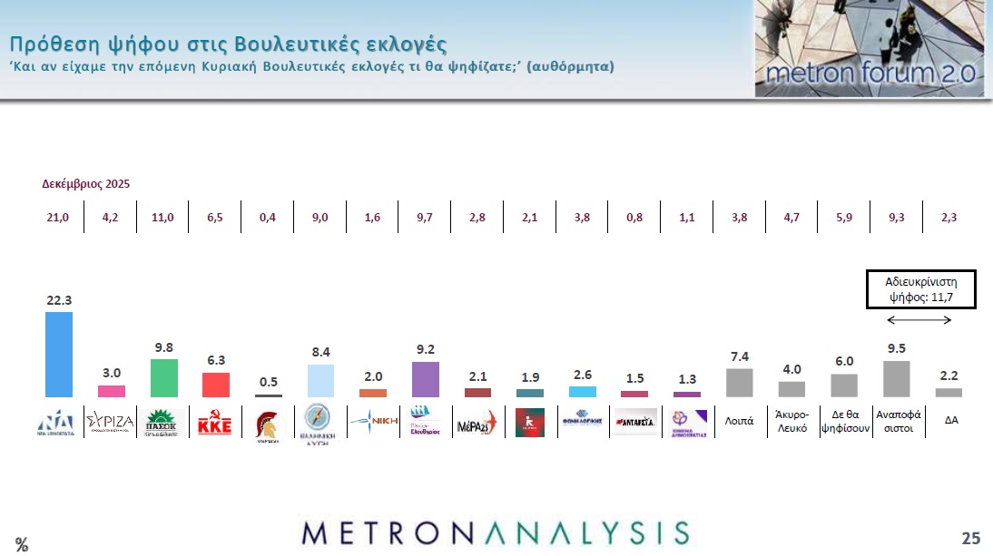 Το κυβερνών κόμμα στην πρόθεση ψήφου από το 21% του Δεκεμβρίου ανεβαίνει στο 22,3%. Το ΠαΣοΚ από το 11% πέφτει στο 9,8% ενώ ο ΣΥΡΙΖΑ από το 4,2% κατρακυλά στο 3%. Πρώτη παρουσιάζει και η Ελληνική Λύση από το 9% στο 8,2% ενώ σε σχεδόν σταθερά ποσοστά παραμένουν ΚΚΕ και Πλεύση Ελευθερίας.