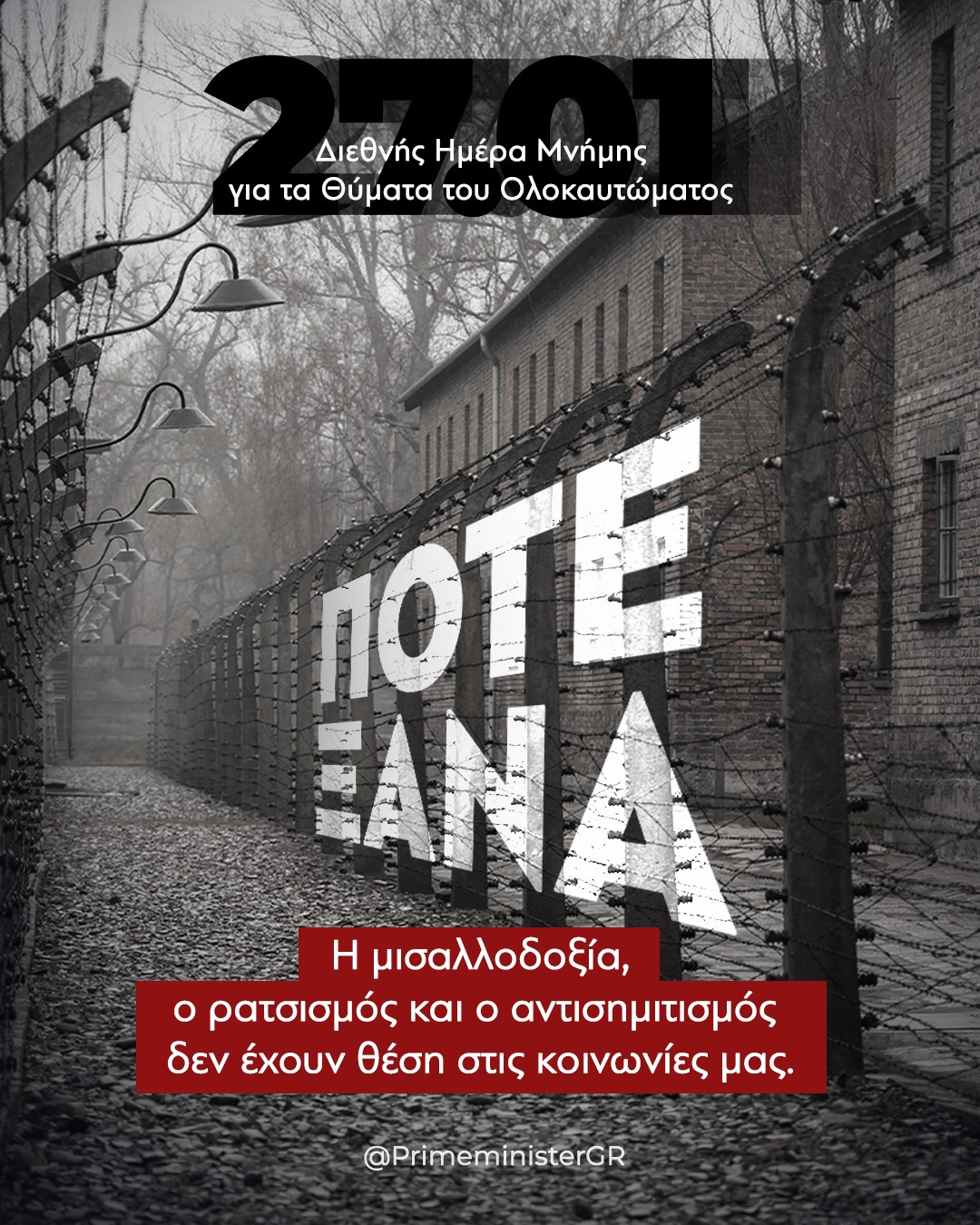 «Δεν μπορούμε να αλλάξουμε το παρελθόν. Αλλά είναι στο χέρι μας να χτίσουμε ένα καλύτερο μέλλον. Ας κάνουμε, λοιπόν, το «Ποτέ Ξανά» σύνθημα αυτής της διαρκούς προσπάθειας. Ένα διαχρονικό και συλλογικό κάλεσμα να μετατρέπουμε τη μνήμη σε συνειδητή δράση. Και τις εμπειρίες του χθες, σε ζωντανές ελπίδες του αύριο», ανέφερε σε ανάρτησή του στα μέσα κοινωνικής δικτύωσης ο κ. Μητσοτάκης.