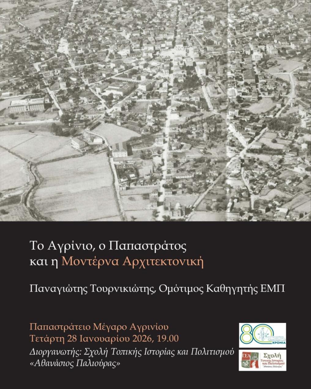 Διάλεξη με θέμα «Το Αγρίνιο, ο Παπαστράτος και η Μοντέρνα Αρχιτεκτονική» θα πραγματοποιηθεί την Τετάρτη 28 Ιανουαρίου 2026, στο Παπαστράτειο Μέγαρο Αγρινίου, με ομιλητή τον ομότιμο καθηγητή του ΕΜΠ Παναγιώτη Τουρνικιώτη.