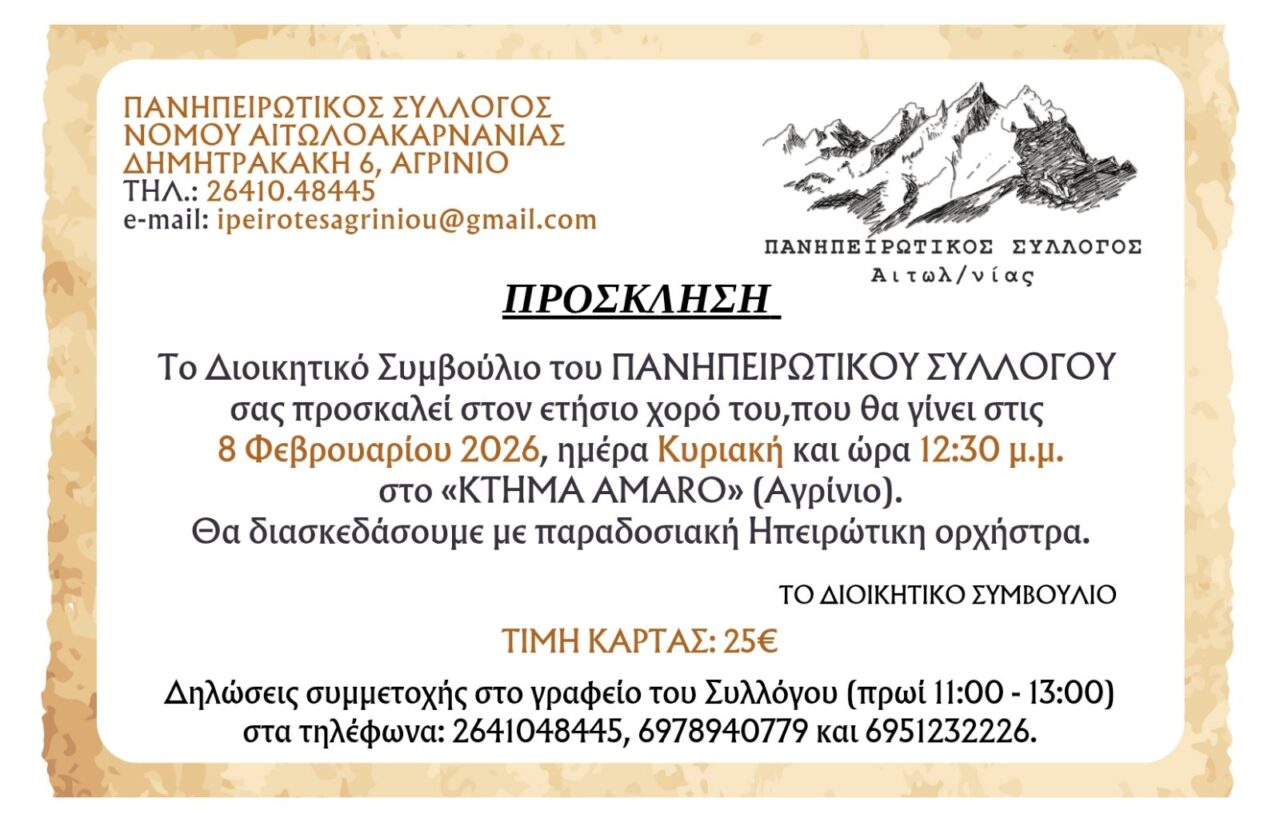 Το Διοικητικό Συμβούλιο του ΠΑΝΗΠΕΙΡΩΤΙΚΟΥ ΣΥΛΛΟΓΟΥ σας προσκαλεί στον ετήσιο χορό του, που θα γίνει στις 8 Φεβρουαρίου 2026, ημέρα Κυριακή και ώρα 12:30 μ.μ. στο «ΚΤΗΜΑ ΑMARO» (Αγρίνιο).