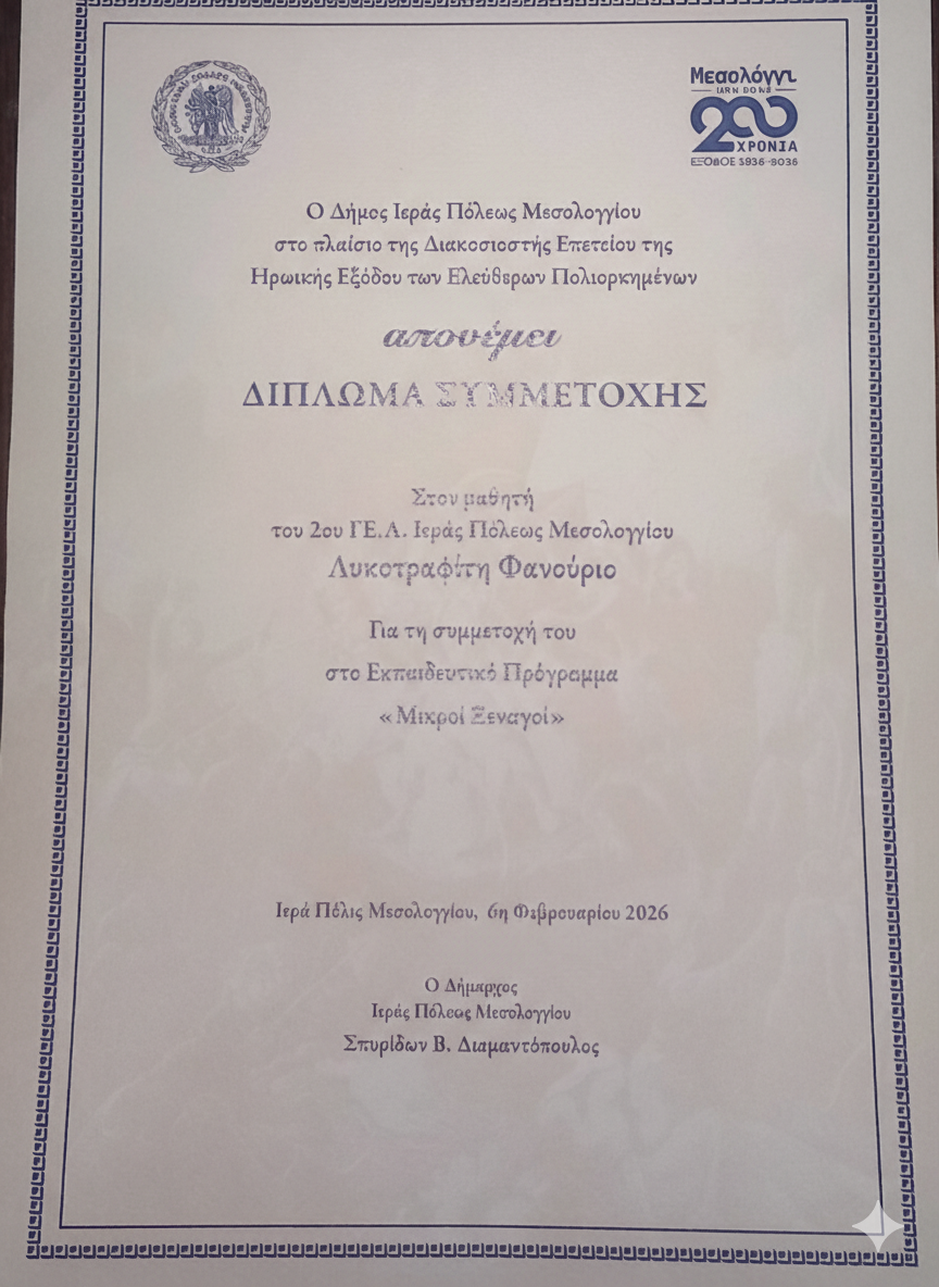 Στο πλαίσιο του εκπαιδευτικού προγράμματος «Μικροί Ξεναγοί», που υλοποιήθηκε στο Μεσολόγγι από τον Δήμο Ιεράς Πόλεως Μεσολογγίου σε συνεργασία με το «Μεσολόγγι των Ντόπιων» και τον κ. Γεώργιο Αποστολάκο, δύο μαθητές της Β΄ τάξης του 2ου Γενικού Λυκείου Μεσολογγίου, ο Φανούρης Λυκοτραφίτης και ο Γιώργος Ξεσφίγγης, συμμετείχαν ενεργά σε δράση αφιερωμένη στην ανάδειξη της ιστορίας και του πολιτισμού της πόλης μας.