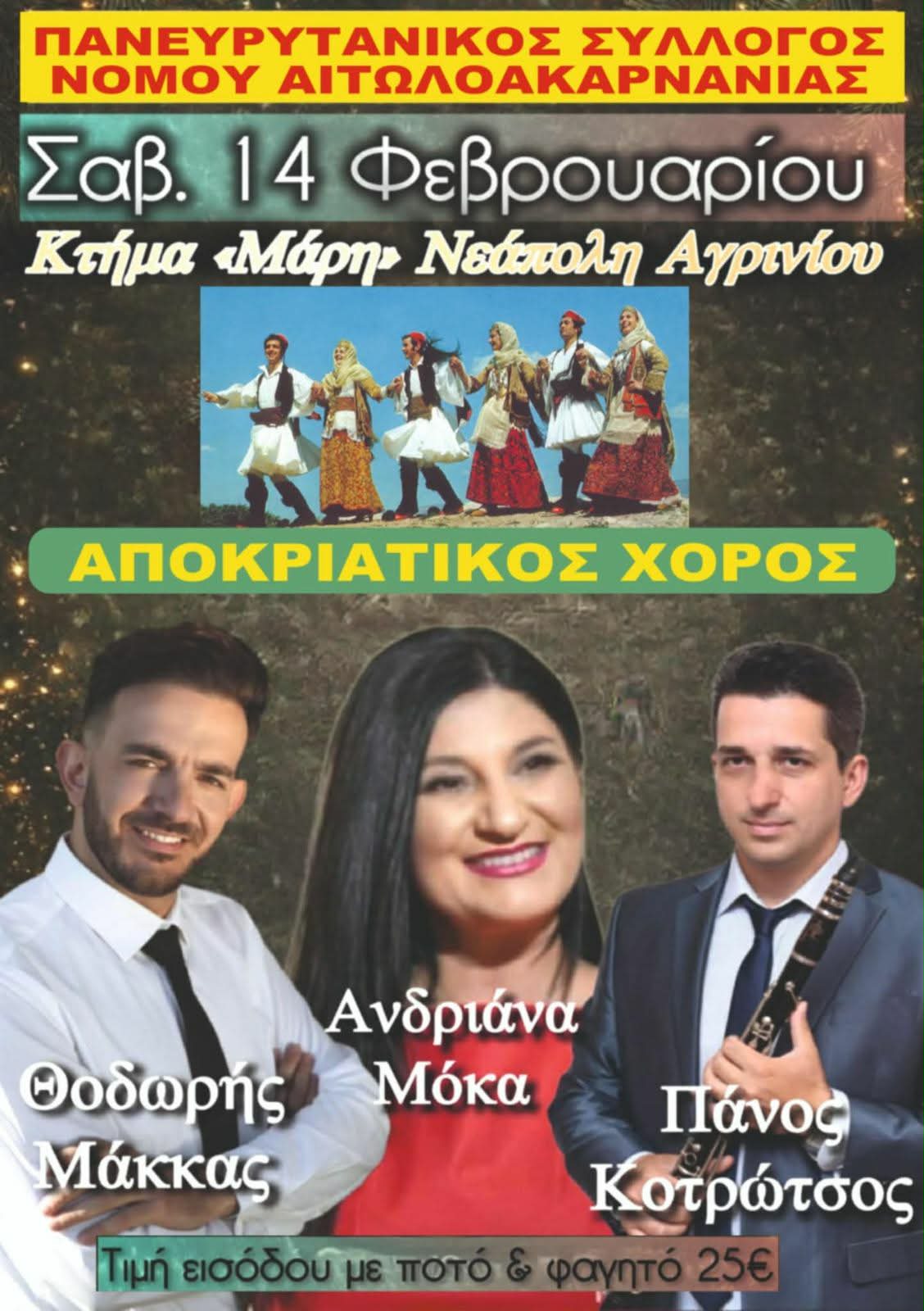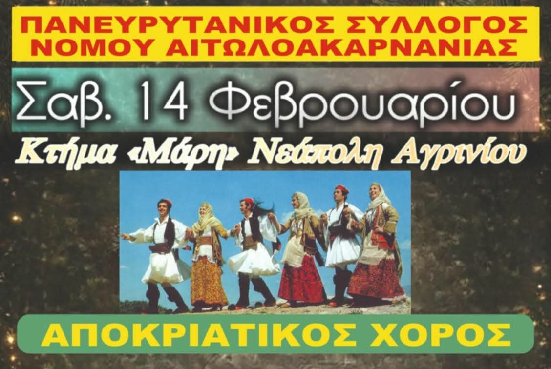 Ο Πανευρυτανικός Σύλλογος και τα μέλη του σας προσκαλούν στον Αποκριάτικο χορό του που θα γίνει στο Κτήμα “Μάρη” στη Νεάπολη Αγρινίου το Σάββατο 14 Φεβρουαρίου 2026