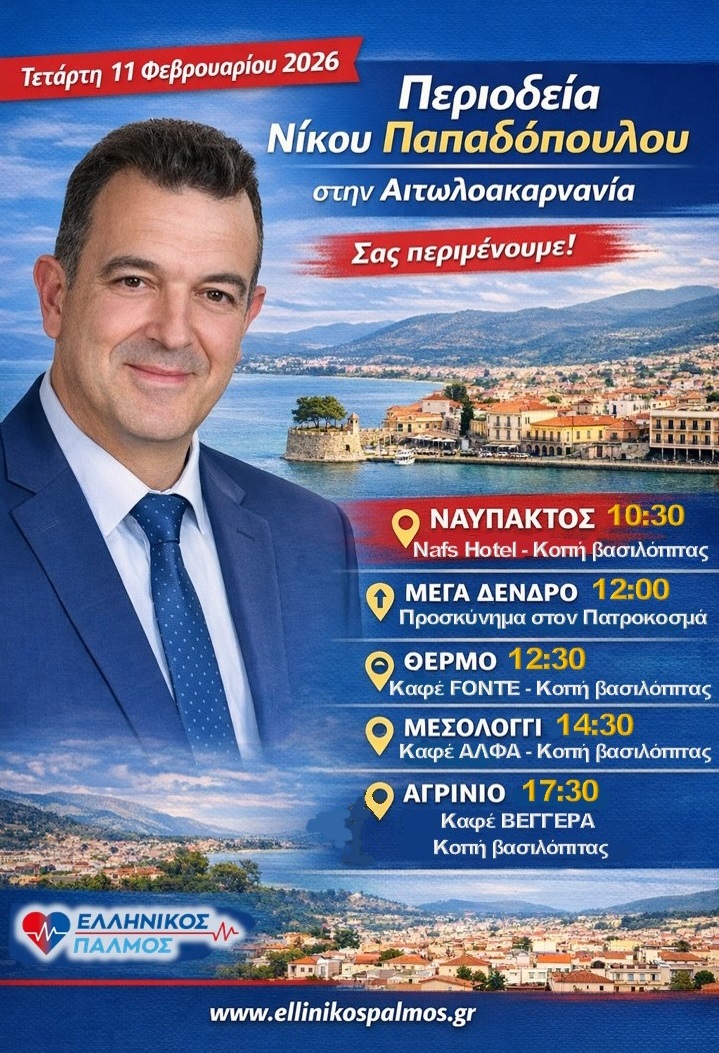 Επίσκεψη σε πόλεις της Αιτωλ/νίας πραγματοποιεί την Τετάρτη 11 Φεβρουαρίου, ο ανεξάρτητος βουλευτής και πρόεδρος του Ελληνικού Παλμού κ. Νίκος Παπαδόπουλος, για κοπή Αγιοβασιλόπιτας και κυρίως να