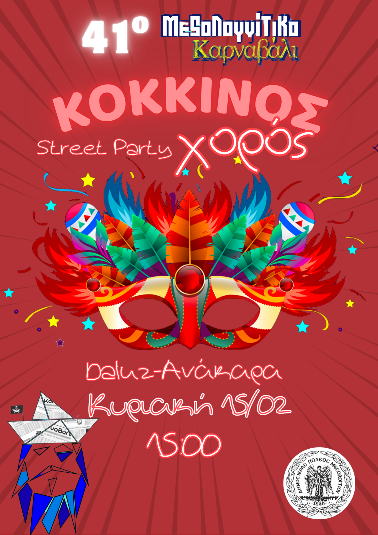 Ο Δήμος Ιεράς Πόλεως Μεσολογγίου προσκαλεί μικρούς και μεγάλους στο πιο εκρηκτικό αποκριάτικο γεγονός της χρονιάς! Στο πλαίσιο του 41ου Μεσολογγίτικου Καρναβαλιού, διοργανώνεται το εντυπωσιακό «Κόκκινος Χορός» Street Party, μια γιορτή γεμάτη ρυθμό, χρώμα και καρναβαλική διάθεση.