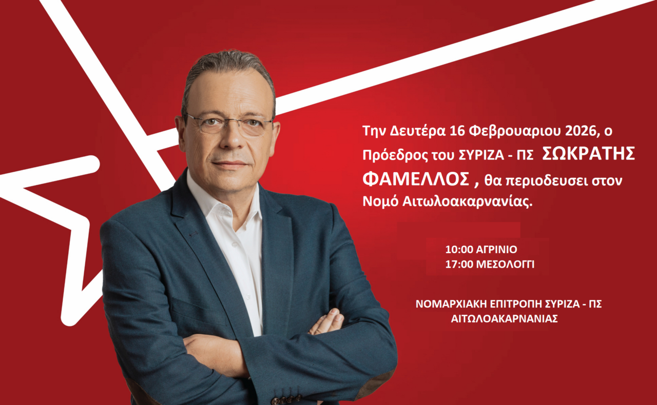 Επίσκεψη στην Αιτωλοακαρνανία θα πραγματοποιήσει ο πρόεδρος του ΣΥΡΙΖΑ Σωκράτης Φάμελλος τη Δευτέρα 16 Φεβρουαρίου 2026.