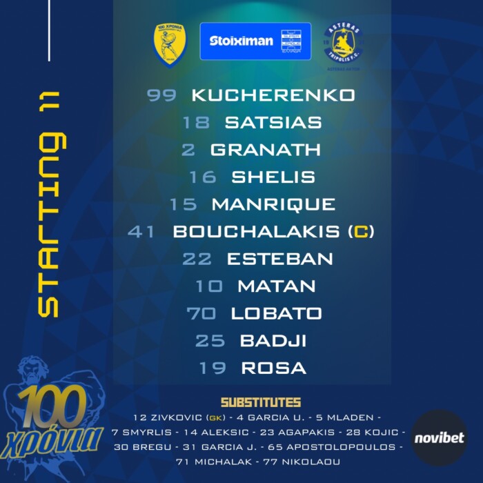 ΑΣΤΕΡΑΣ (Μίλαν Ράσταβατς): Παπαδόπουλος, Αλάγκμπε, Σιλά, Κάστανο, Δεληγιαννίδης, Μουνιόθ, Τσίκο, Μπαρτόλο, Κετού, Τζοακίνι, Μίτροβιτς