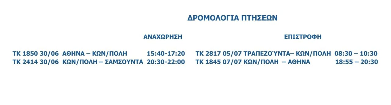 ΤΚ 2414 30/06 ΚΩΝ/ΠΟΛΗ – ΣΑΜΣΟΥΝΤΑ 20:30-22:00 ΤΚ 1845 07/07 ΚΩΝ/ΠΟΛΗ – ΑΘΗΝΑ 18:55 – 20:30
