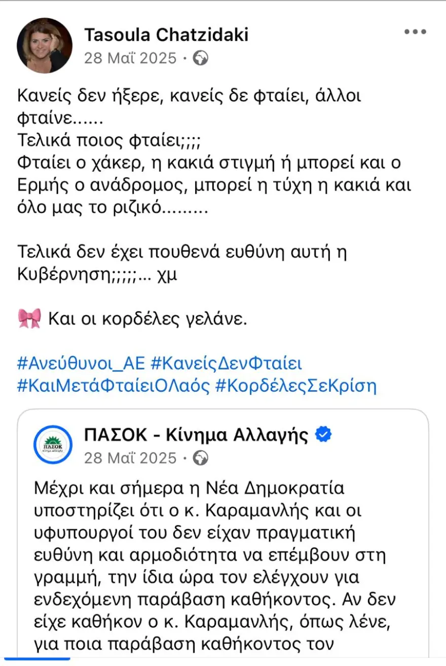 Σε άλλη ανάρτηση, δε, χαρακτήριζε «ομολογία ενοχής» τις παραιτήσεις που έχουν υποβληθεί από στελέχη της κυβερνώσας παράταξης.