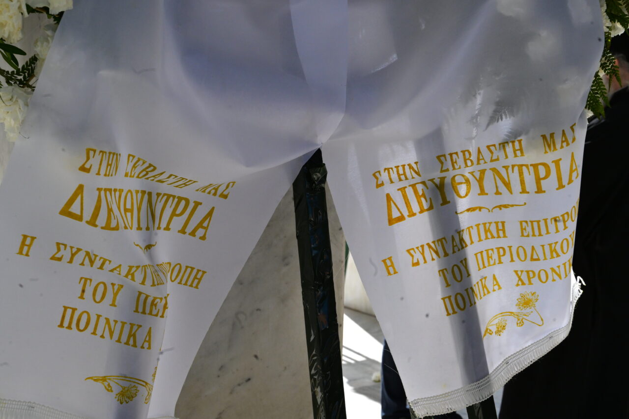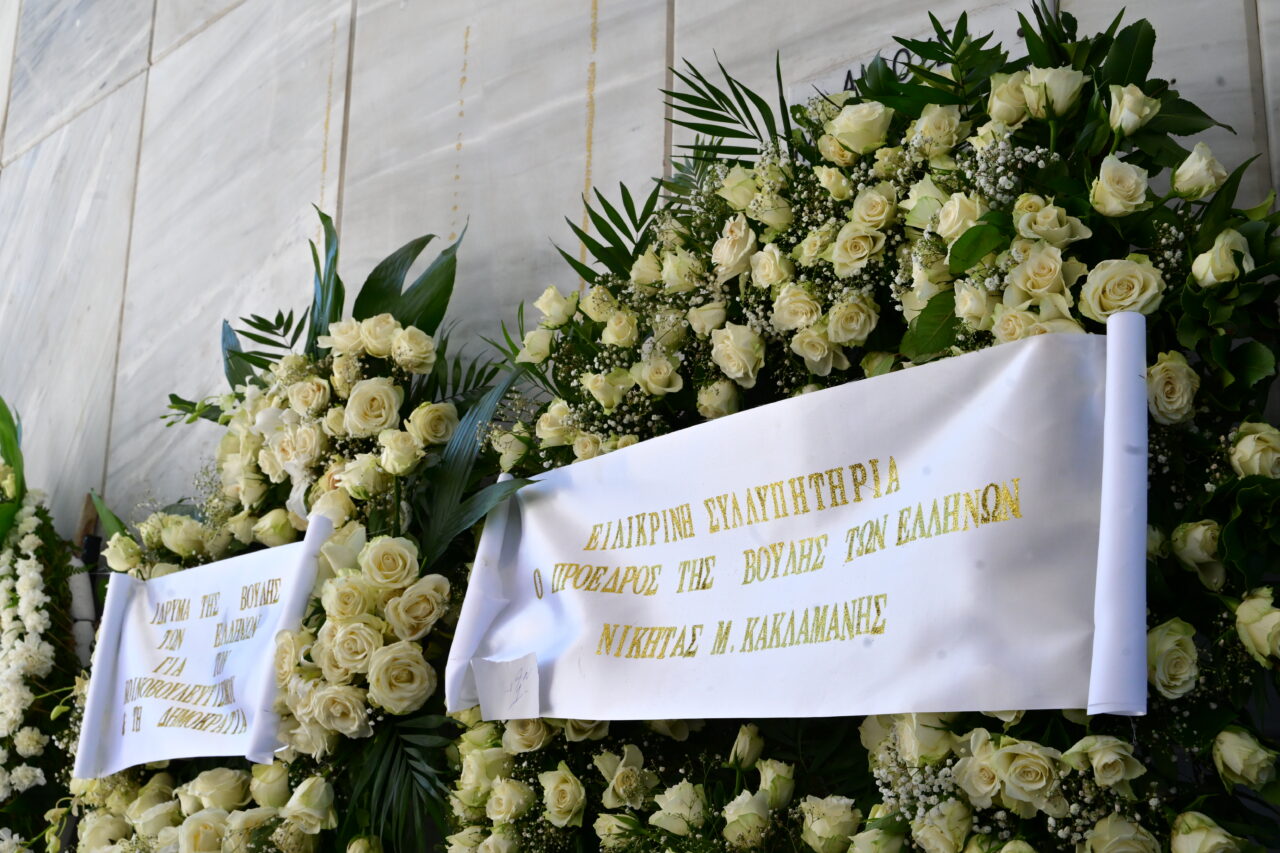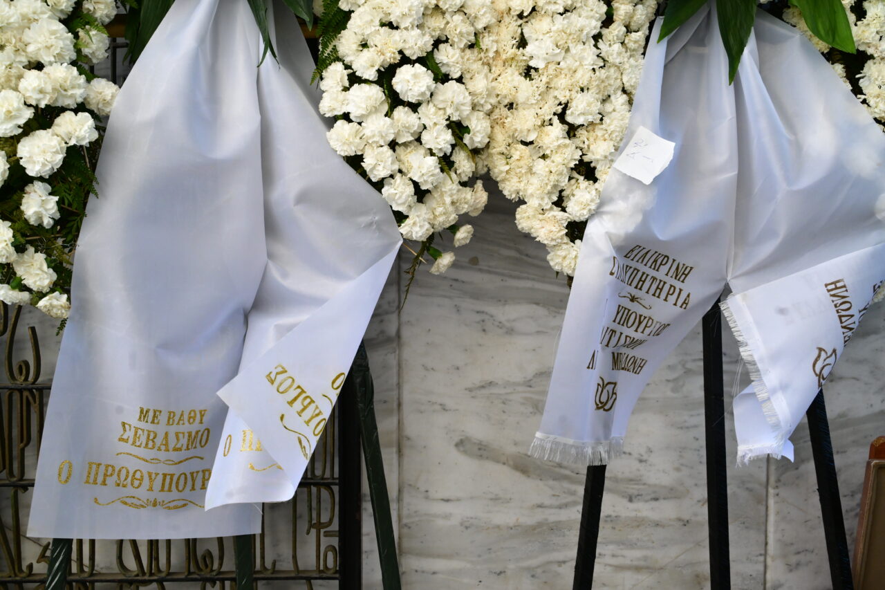 Στο Α’ Νεκροταφείο βρίσκονται, μεταξύ άλλων, ο πρώην υπηρεσιακός πρωθυπουργός Παναγιώτης Πικραμένος, η Σοφία Βούλτεψη και οι πρώην υπουργοί Γιώργος Αλογοσκούφης και Γιάννης Βαληνάκης ενώ στεφάνια έστειλαν ο πρωθυπουργός Κυριάκος Μητσοτάκης, η υπουργός Πολιτισμού, Λίνα Μενδώνη, ο υπουργός Μετανάστευσης, Θάνος Πλεύρης, ο πρόεδρος της Βουλής, Νικήτας Κακλαμάνης κ.α.