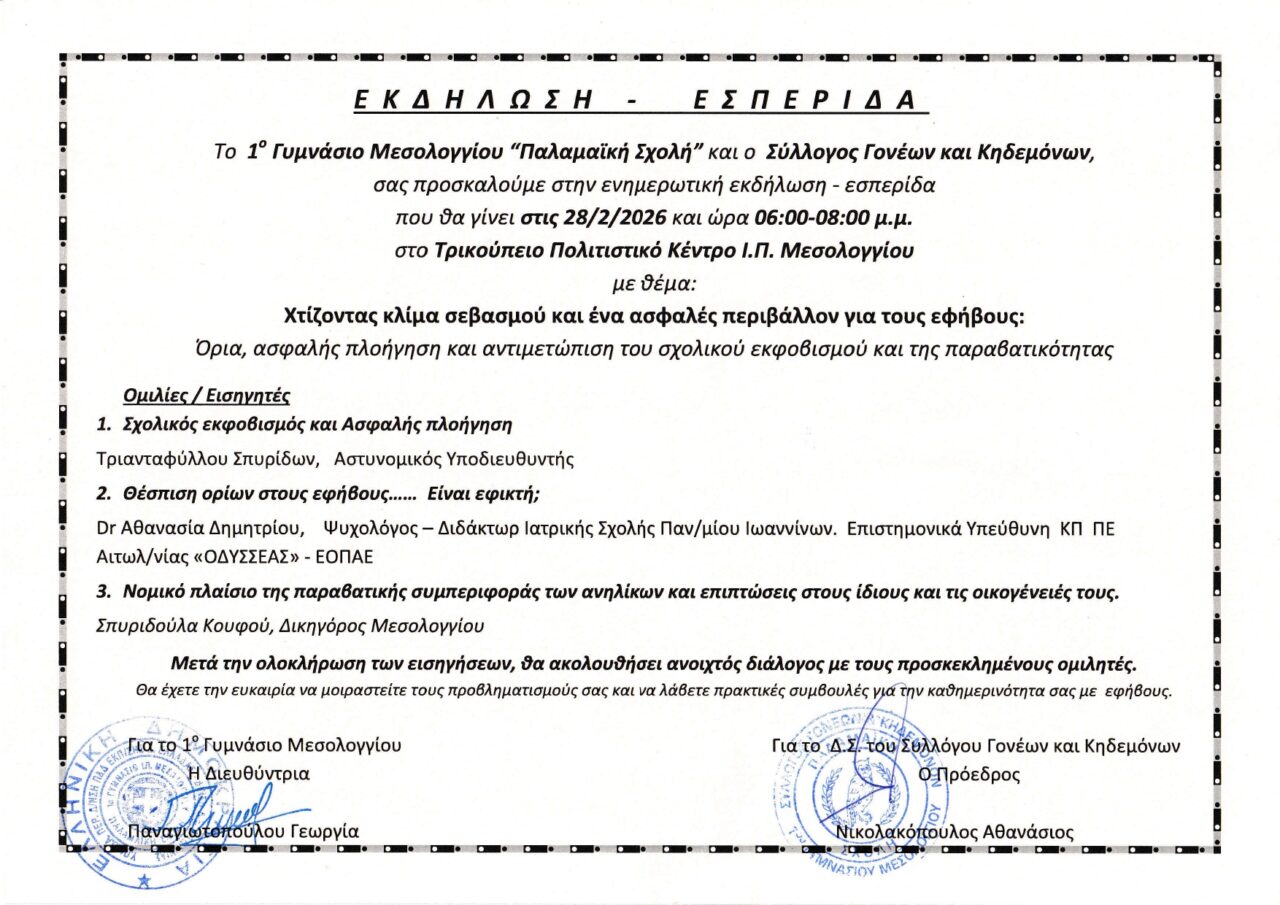 Το 1ο Γυμνάσιο Μεσολογγίου «Παλαμαϊκή Σχολή» και ο Σύλλογος Γονέων και Κηδεμόνων, σας προσκαλούν στην ενημερωτική εκδήλωση – εσπερίδα που θα γίνει στις 28/2/2026 και ώρα 06:00–08:00 μ.μ. στο Τρικούπειο Πολιτιστικό Κέντρο Ι.Π. Μεσολογγίου με θέμα: «Χτίζοντας κλίμα σεβασμού και ένα ασφαλές περιβάλλον για τους εφήβους: Όρια, ασφαλής πλοήγηση και αντιμετώπιση του σχολικού εκφοβισμού και της παραβατικότητας».