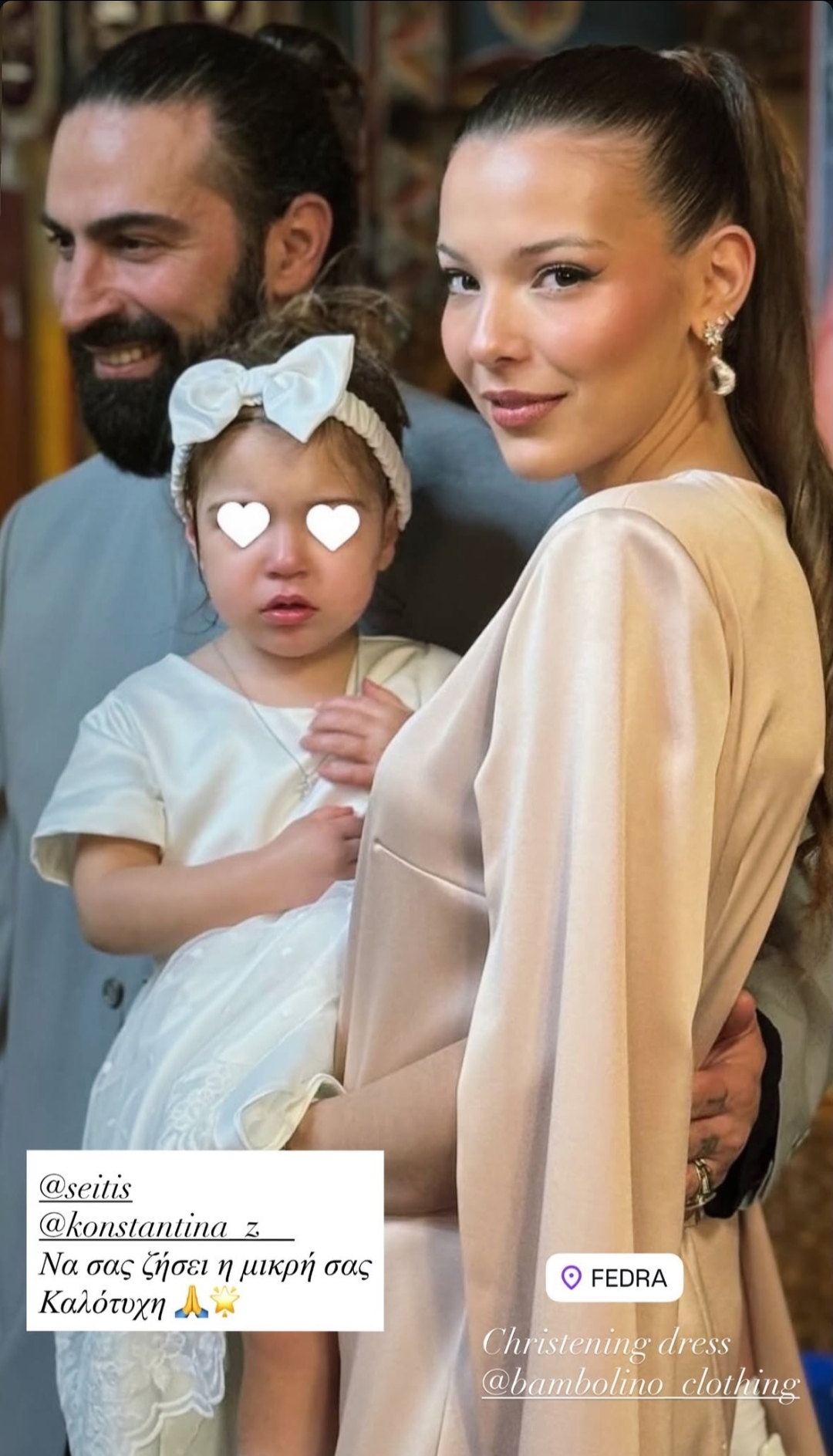 Αίσθηση προκάλεσε και η τρυφερή φωτογραφία που κυκλοφόρησε στα μέσα κοινωνικής δικτύωσης, όπου ο Μιχάλης Σεΐτης ποζάρει χαμογελαστός στο πλευρό της συζύγου του, κρατώντας στην αγκαλιά τους τη μικρή τους πριγκίπισσα.
