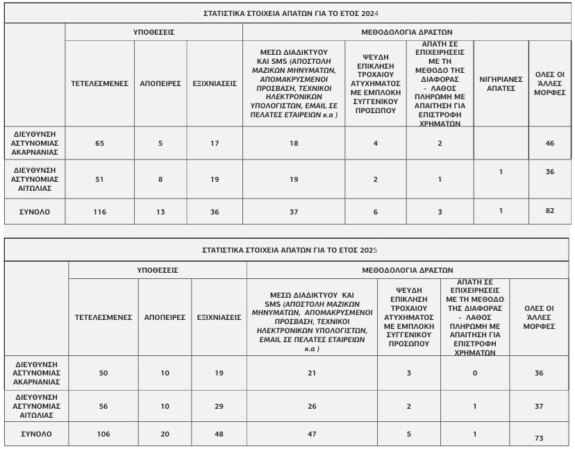 Συνολικά στην Αιτωλοακαρνανία (και στις δύο Διευθύνσεις της Αστυνομίας) οι τετελεσμένες απάτες το 2025 παρουσιάζουν μείωση κατά 8,6% σε σχέση με το 2024 οι απόπειρες παρουσιάζουν αύξηση κατά 53,8% και οι εξιχνιάσεις αυξήθηκαν κατά 33,3%.