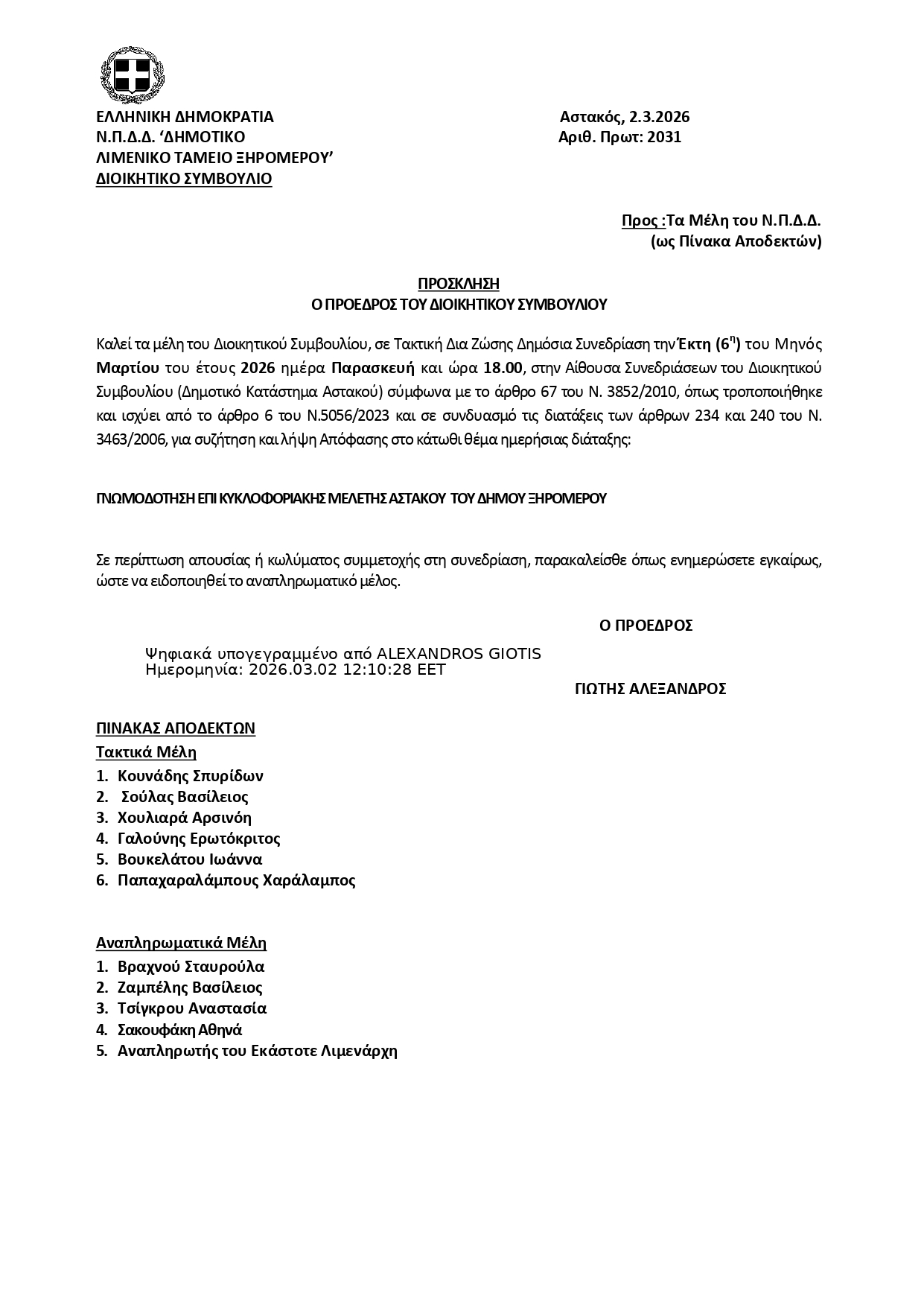 Ο πρόεδρος του Διοικητικού Συμβουλίου καλεί τα μέλη του Διοικητικού Συμβουλίου, σε Τακτική Δια Ζώσης Δημόσια Συνεδρίαση την Έκτη (6η) του Μηνός Μαρτίου του έτους 2026 ημέρα Παρασκευή και ώρα 18.00, στην Αίθουσα Συνεδριάσεων του Διοικητικού Συμβουλίου (Δημοτικό Κατάστημα Αστακού) σύμφωνα με το άρθρο 67 του Ν. 3852/2010, όπως τροποποιήθηκε και ισχύει από το άρθρο 6 του Ν.5056/2023 και σε συνδυασμό τις διατάξεις των άρθρων 234 και 240 του Ν. 3463/2006, γιασυζήτηση και λήψη Απόφασης στο κάτωθι θέματα ημερήσιας διάταξης: