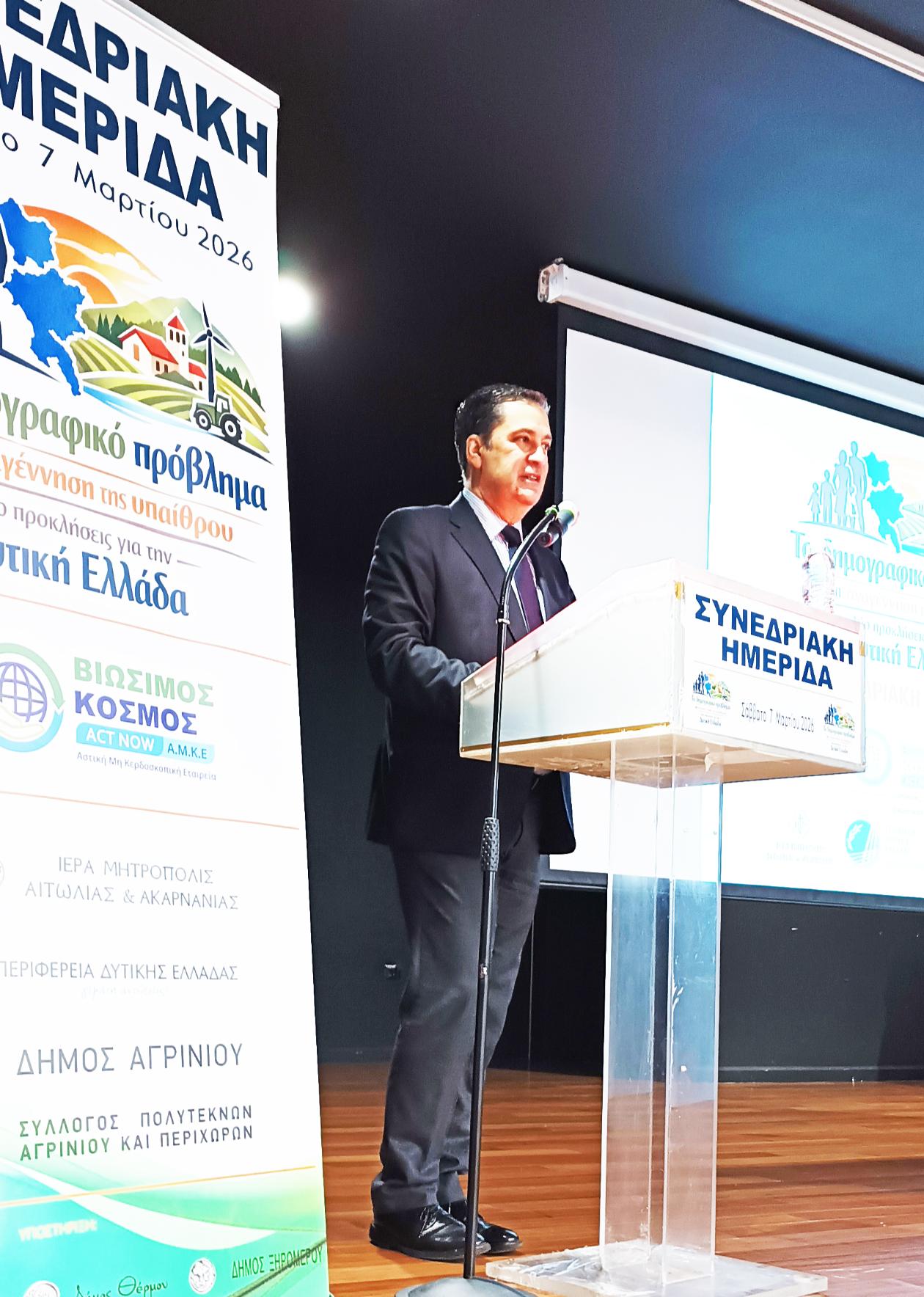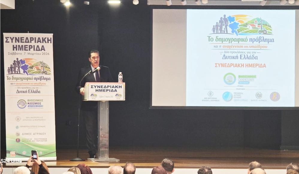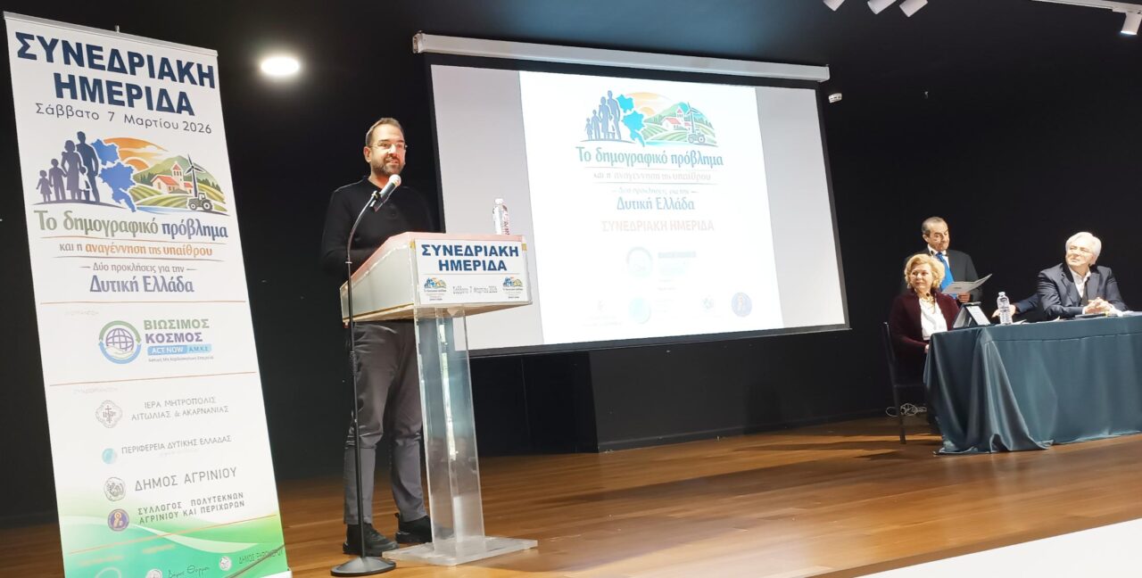 Με πρωτοβουλία της Αστικής Μη Κερδοσκοπικής Εταιρείας «Βιώσιμος Κόσμος» και με τη συνδιοργάνωση της Ιεράς Μητροπόλεως Αιτωλίας και Ακαρνανίας , του Δήμου Αγρινίου, του Συλλόγου Πολυτέκνων Αγρινίου και Περιχώρων, της Περιφέρειας Δυτικής Ελλάδας, της ΠΕΔ και τη στήριξη των Δήμων Θέρμου και Ξηρομέρου πραγματοποιήθηκε με απόλυτη επιτυχία, το Σάββατο 7 Μαρτίου 2026 στο Αγρίνιο μια ιδιαίτερα σημαντική συνεδριακή ημερίδα με θέμα: «Το Δημογραφικό Πρόβλημα και η Αναγέννηση της Υπαίθρου – Δύο Προκλήσεις για τη Δυτική Ελλάδα».