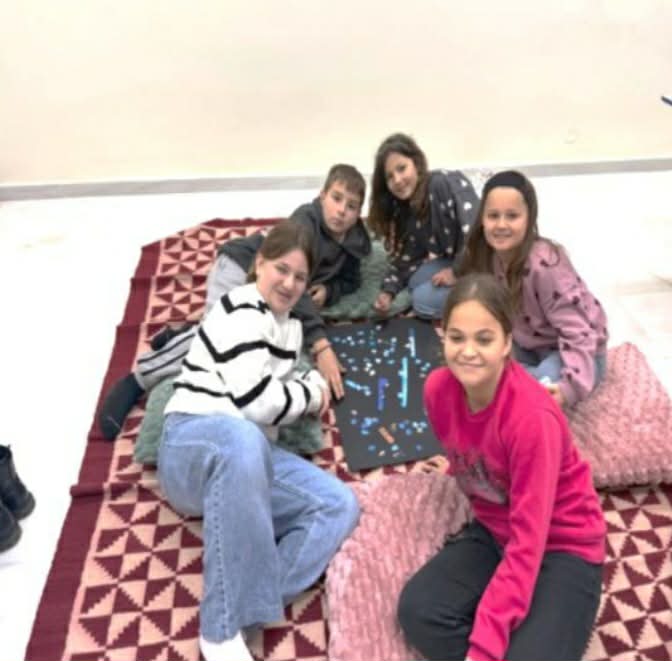 Πολλοί μαθητές σταματούν να παρατηρήσουν τα σχέδια, να αναγνωρίσουν σχήματα και να συζητήσουν για την τέχνη της υφαντικής.