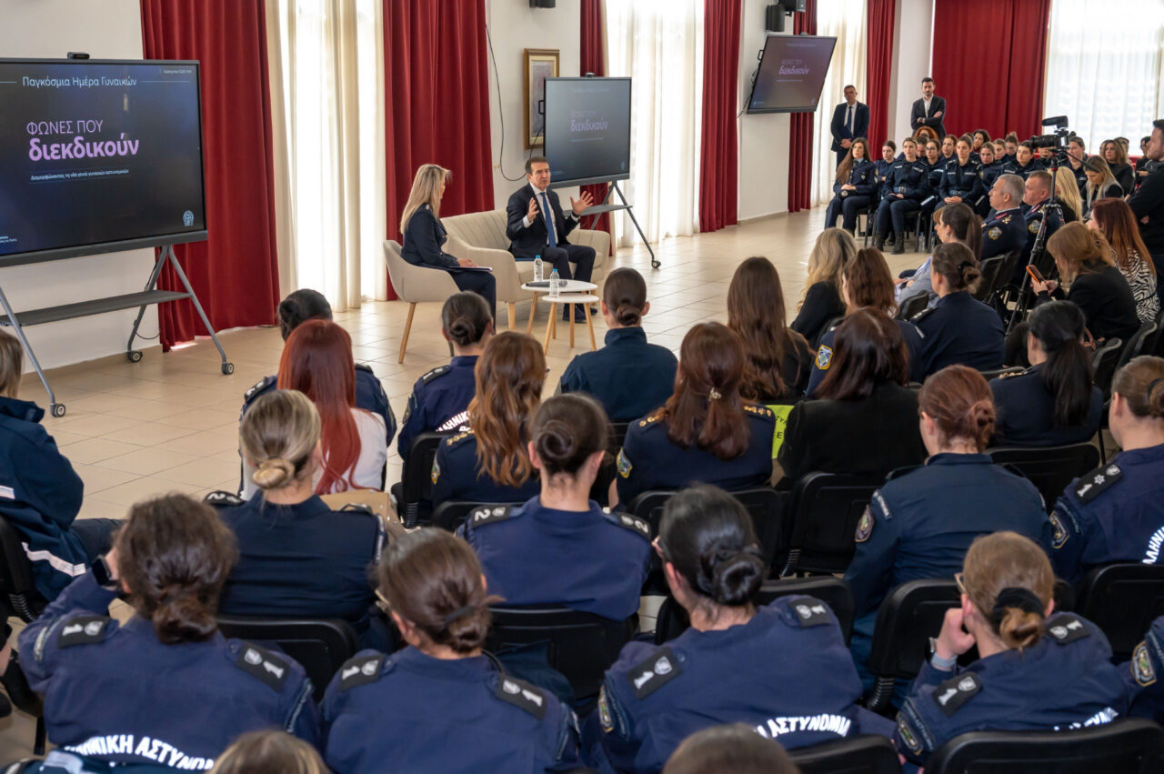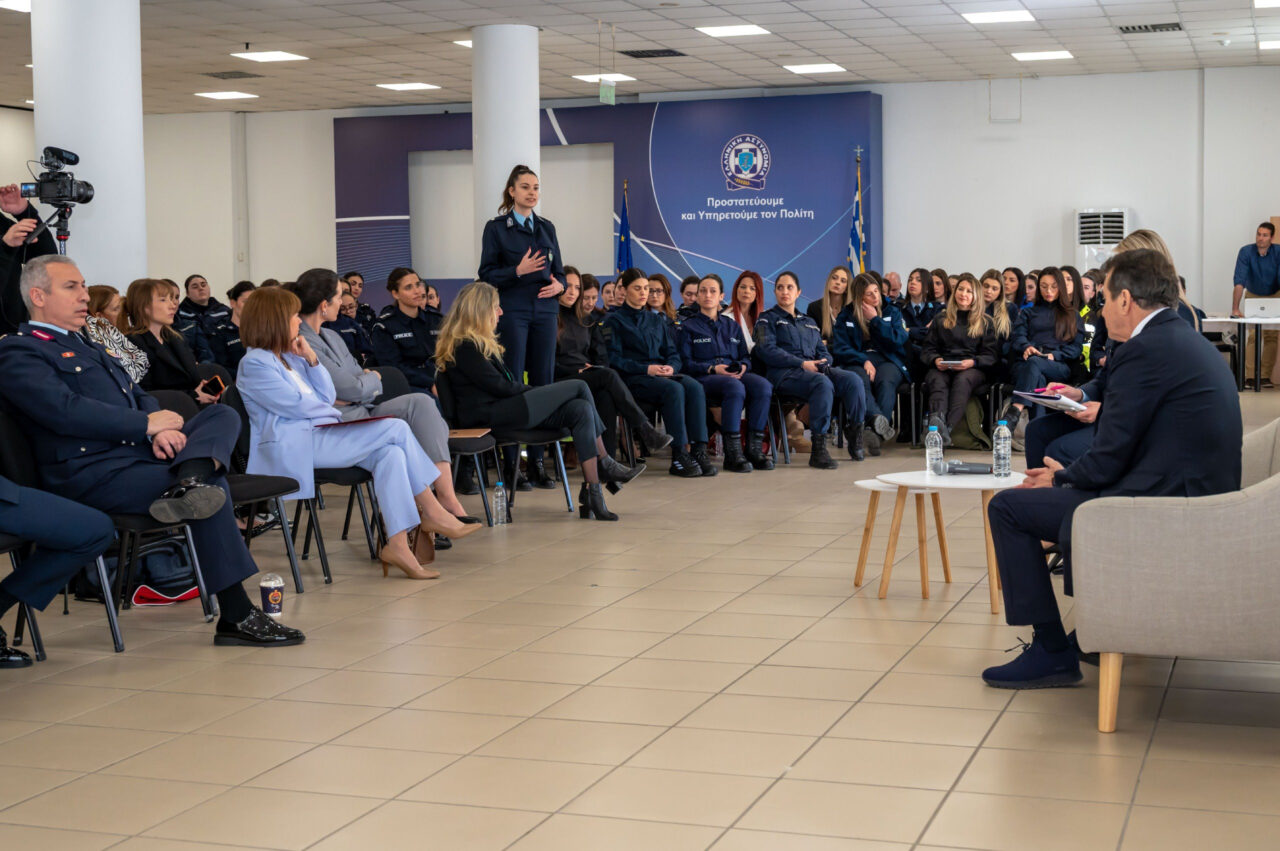 «Οι προκλήσεις είναι εδώ, είναι ανοιχτές και σας καλώ να ανταποκριθείτε γιατί η πολιτική βούληση είναι δεδομένη και ισχυρή και να είστε βέβαιες ότι όλες όσες έχετε τη δυνατότητα αυτή, εμείς θα σας δώσουμε την ευκαιρία να την εξαντλήσετε», ήταν το μήνυμα που απηύθυνε ο Υπουργός Προστασίας του Πολίτη, Μιχάλης Χρυσοχοΐδης μιλώντας σε δόκιμες Υπαστυνόμους, σε Αστυνομικούς γυναίκες από επιχειρησιακές υπηρεσίες, όπως και σε Ανώτατες και Ανώτερες Αξιωματικούς που υπηρετούν σε θέσεις ευθύνης, στο πλαίσιο της δράσης για την ενδυνάμωση των νέων γυναικών της ΕΛ.ΑΣ, με τον τίτλο: «Διαμορφώνοντας τη νέα γενιά γυναικών αστυνομικών», που πραγματοποιήθηκε στη Σχολή Αξιωματικών της Ελληνικής Αστυνομίας, τη Δευτέρα 9 Μαρτίου 2026.
