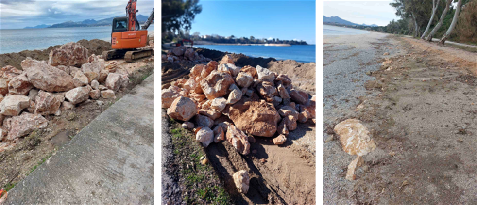 Συγκεκριμένα στη ζώνη αιγιαλού και παραλίας, έχουν πραγματοποιηθεί εργασίες, που περιλαμβάνουν εκσκαφές και επιχώσεις, αποψίλωση βλάστησης, εναπόθεση βαρέων υλικών, όπως μεγάλες πέτρες λατομείου, υλικών εκσκαφής επάνω στην αμμουδιά, ενδεχομένως δε κατά τμήματα εντός ζώνης αιγιαλού. Οι εργασίες αυτές έχουν αλλοιώσει σημαντικά το φυσικό τοπίο και επηρεάζουν αρνητικά το παράκτιο και χερσαίο οικοσύστημα.