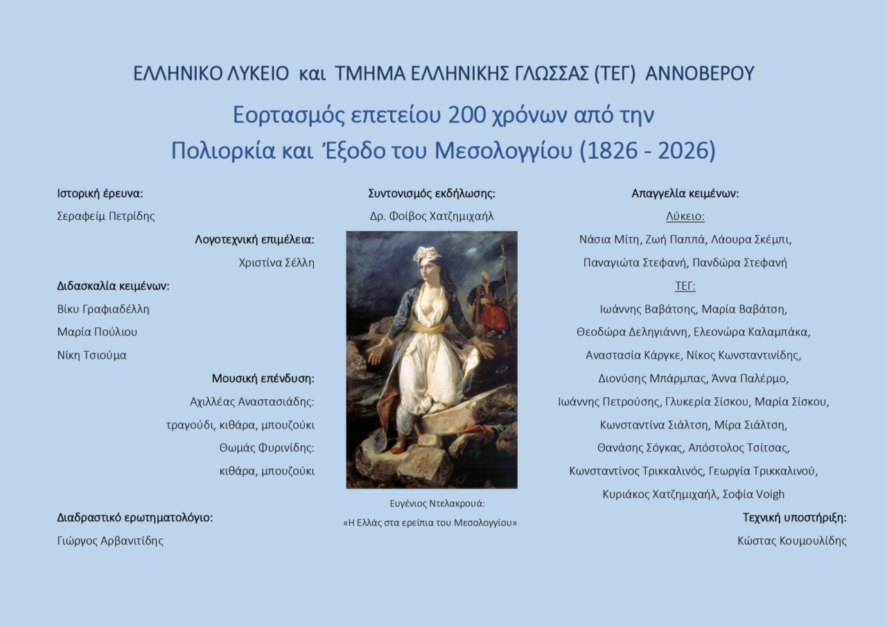 Εκδήλωση αφιερωμένη στη Διακοσιοστή Επέτειο της Εξόδου του Μεσολογγίου θα πραγματοποιηθεί την Κυριακή 15 Μαρτίου 2026 στο Αννόβερο, με πρωτοβουλία του Ελληνικού Λυκείου και του Τμήματος Ελληνικής Γλώσσας (ΤΕΓ) της πόλης.
