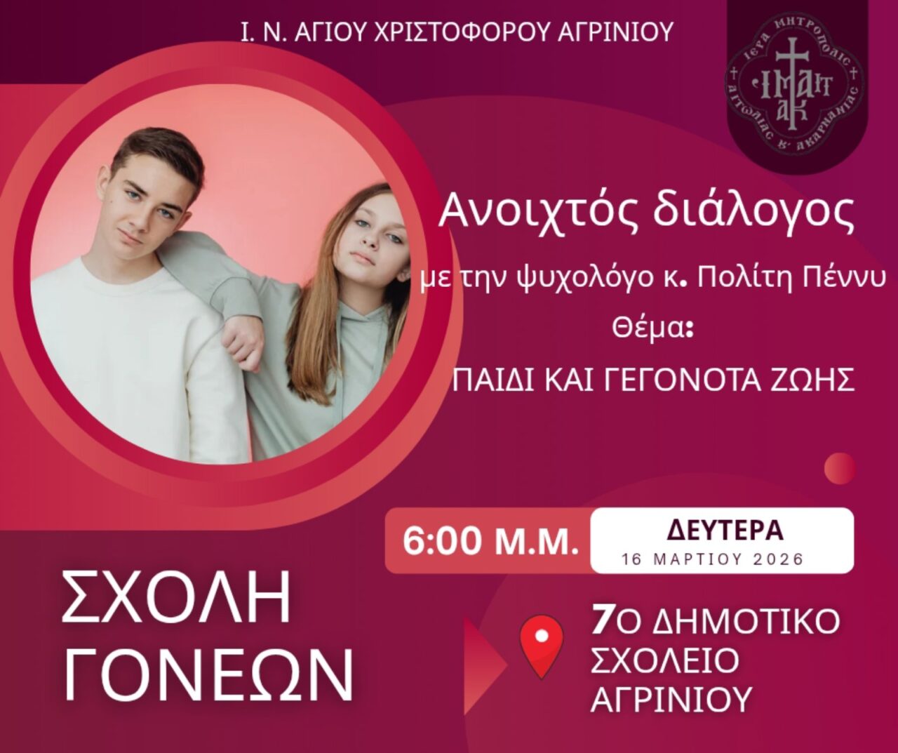 Την ερχόμενη Δευτέρα (16.3.26) θα πραγματοποιηθεί η τελευταία συνάντηση της Ενοριακής Σχολής Γονέων του Ιερού Ναού Αγίου Χριστοφόρου Αγρινίου, με θέμα «Παιδί και γεγονότα ζωής» από την ψυχολόγο Πέννυ Πολίτη.
