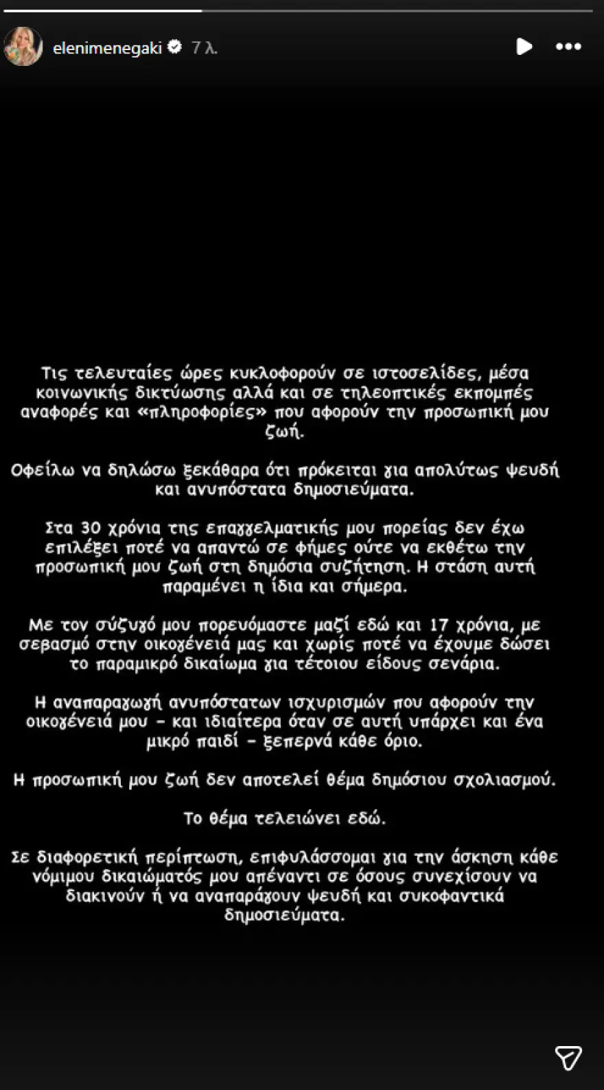 Όπως έγραψε αναλυτικά: «Τις τελευταίες ώρες κυκλοφορούν σε ιστοσελίδες, μέσα κοινωνικής δικτύωσης αλλά και σε τηλεοπτικές εκπομπές αναφορές και “πληροφορίες” που αφορούν στην προσωπική μου ζωή. Οφείλω να δηλώσω ξεκάθαρα ότι πρόκειται για απολύτως ψευδή και ανυπόστατα δημοσιεύματα. Στα 30 χρόνια της επαγγελματικής μου πορείας δεν έχω επιλέξει ποτέ να απαντώ σε φήμες ούτε να εκθέτω την προσωπική μου ζωή στη δημόσια συζήτηση. Η στάση αυτή παραμένει η ίδια και σήμερα».