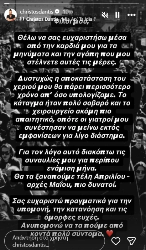 «Φίλοι μου, θέλω να σας ευχαριστήσω μέσα από την καρδιά μου για τα μηνύματα και την αγάπη που μου στέλνετε αυτές τις μέρες. Δυστυχώς η αποκατάσταση του χεριού μου θα πάρει περισσότερο χρόνο από όσο υπολογίζαμε. Το κάταγμα ήταν πολύ σοβαρό και το χειρουργείο ακόμη πιο απαιτητικό, οπότε οι γιατροί μου συνέστησαν να μείνω εκτός εμφανίσεων για λίγο διάστημα.