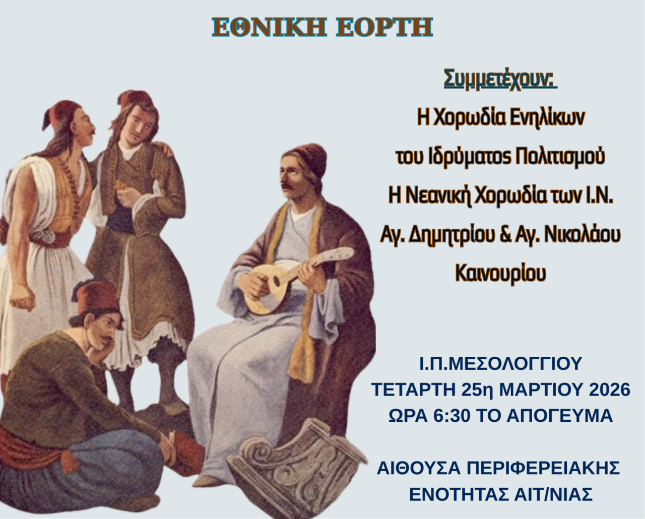 Την Τετάρτη 25 Μαρτίου 2026, ανήμερα της εθνικής μας επετείου, ώρα 6:30 το απόγευμα στην Αίθουσα Περιφερειακής Ενότητας Αιτωλοακαρνανίας.