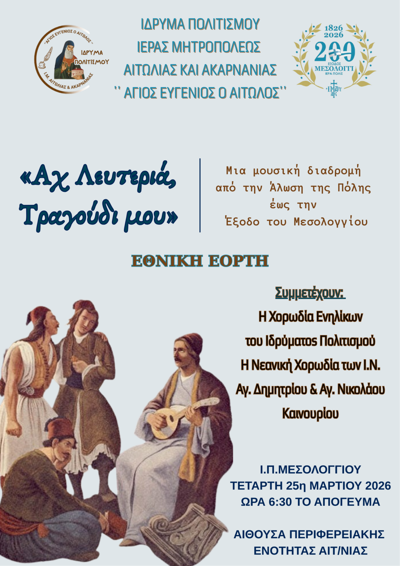 Με αφορμή τη συμπλήρωση 200 ετών από την ηρωική Έξοδο του Μεσολογγίου, ένα από τα κορυφαία γεγονότα της νεότερης ελληνικής ιστορίας, που αποτελεί διαχρονικό σύμβολο αυτοθυσίας και αγώνα για την ελευθερία, καθώς και τον εορτασμό της Εθνικής Επετείου της 25ης Μαρτίου, τιμάται η μνήμη και η παρακαταθήκη των προγόνων μας μέσα από μια ξεχωριστή μουσική εκδήλωση, με την συμμετοχή 130 χορωδών και μουσικού σχήματος, αφιερωμένη στην Ελευθερία, την οποία διοργανώνει το Ίδρυμα Πολιτισμού της Ιεράς Μητροπόλεως Αιτωλίας και Ακαρνανίας «Άγιος Ευγένιος ο Αιτωλός».