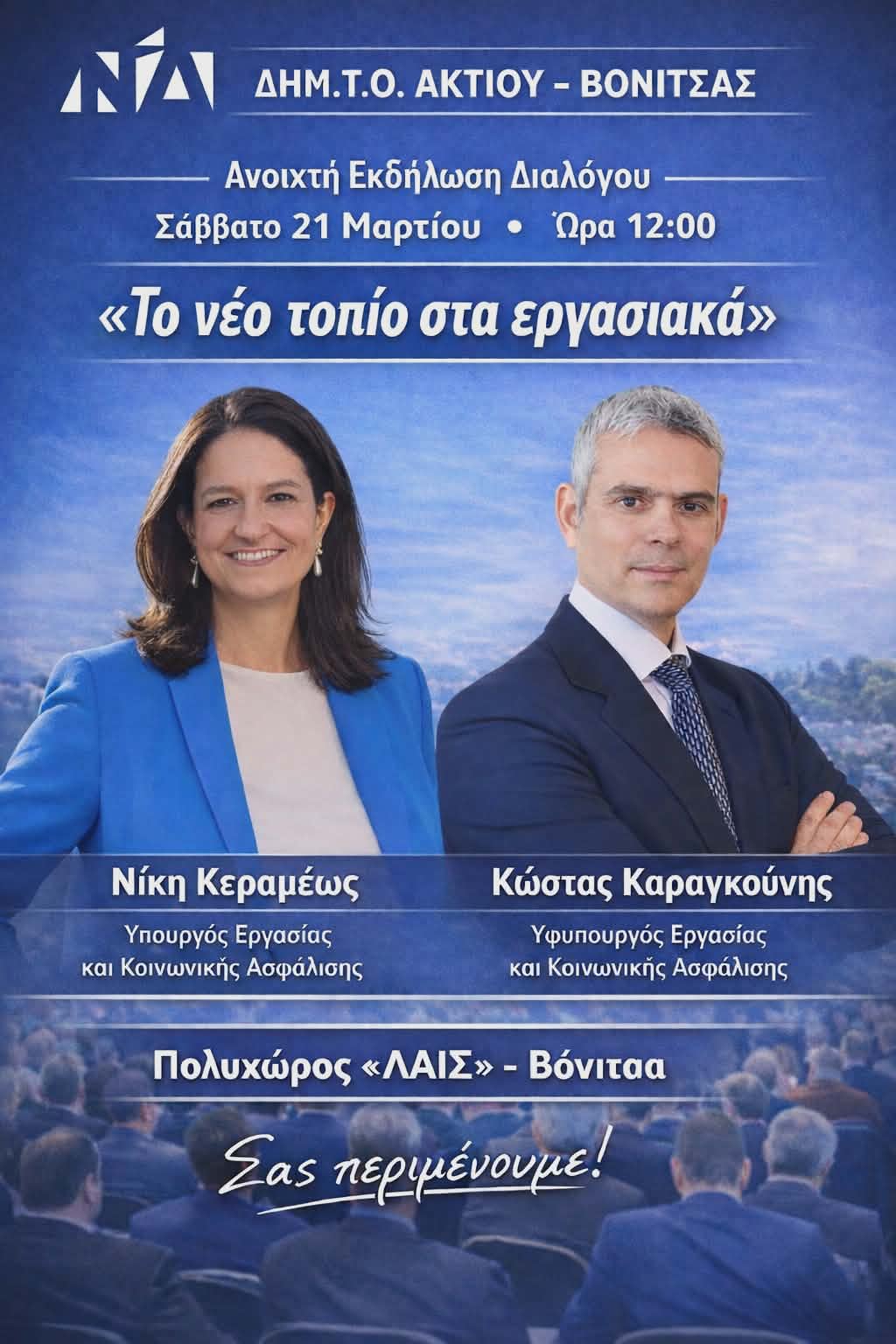 Η ΔΗΜ. Τ.Ο. Ακτίου Βόνιτσας της Ν.Δ. διοργανώνει το Σάββατο 21 Μαρτίου στις 12.00 ανοιχτή συνάντηση διαλόγου με τους πολίτες και τους φορείς της κοινωνίας με θέμα: «Το νέο τοπίο στα εργασιακά».