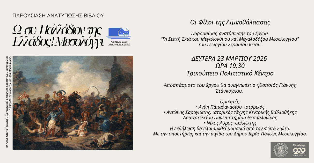 Η εκδήλωση θα πραγματοποιηθεί τη Δευτέρα 23 Μαρτίου 2026 και ώρα 19:30, στο Τρικούπειο Πολιτιστικό Κέντρο.