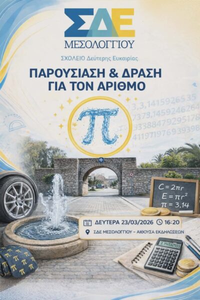 Με αφορμή την Παγκόσμια Ημέρα Μαθηματικών (14 Μαρτίου – 3/14) και τη συμπλήρωση 200 χρόνων από την ηρωική Έξοδο του Μεσολογγίου, το Σχολείο Δεύτερης Ευκαιρίας Μεσολογγίου υλοποίησε μια ξεχωριστή βιωματική εκπαιδευτική δράση.
