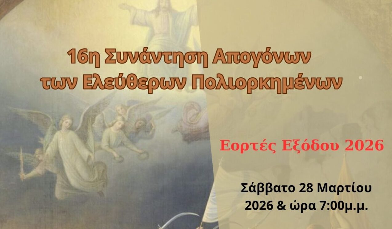 Ο Δήμος Ιεράς Πόλεως Μεσολογγίου και η Διεθνής Αδελφότητα Απογόνων Ελευθέρων Πολιορκημένων διοργανώνουν στο πλαίσιο των επετειακών εκδηλώσεων για τη Διακοσιοστή Επέτειο από την Έξοδο του Μεσολογγίου, την 16η Συνάντηση Απογόνων των Ελευθέρων Πολιορκημένων το Σάββατο 28 Μαρτίου 2026 και ώρα 19:00, στο Τρικούπειο Πολιτιστικό Κέντρο.