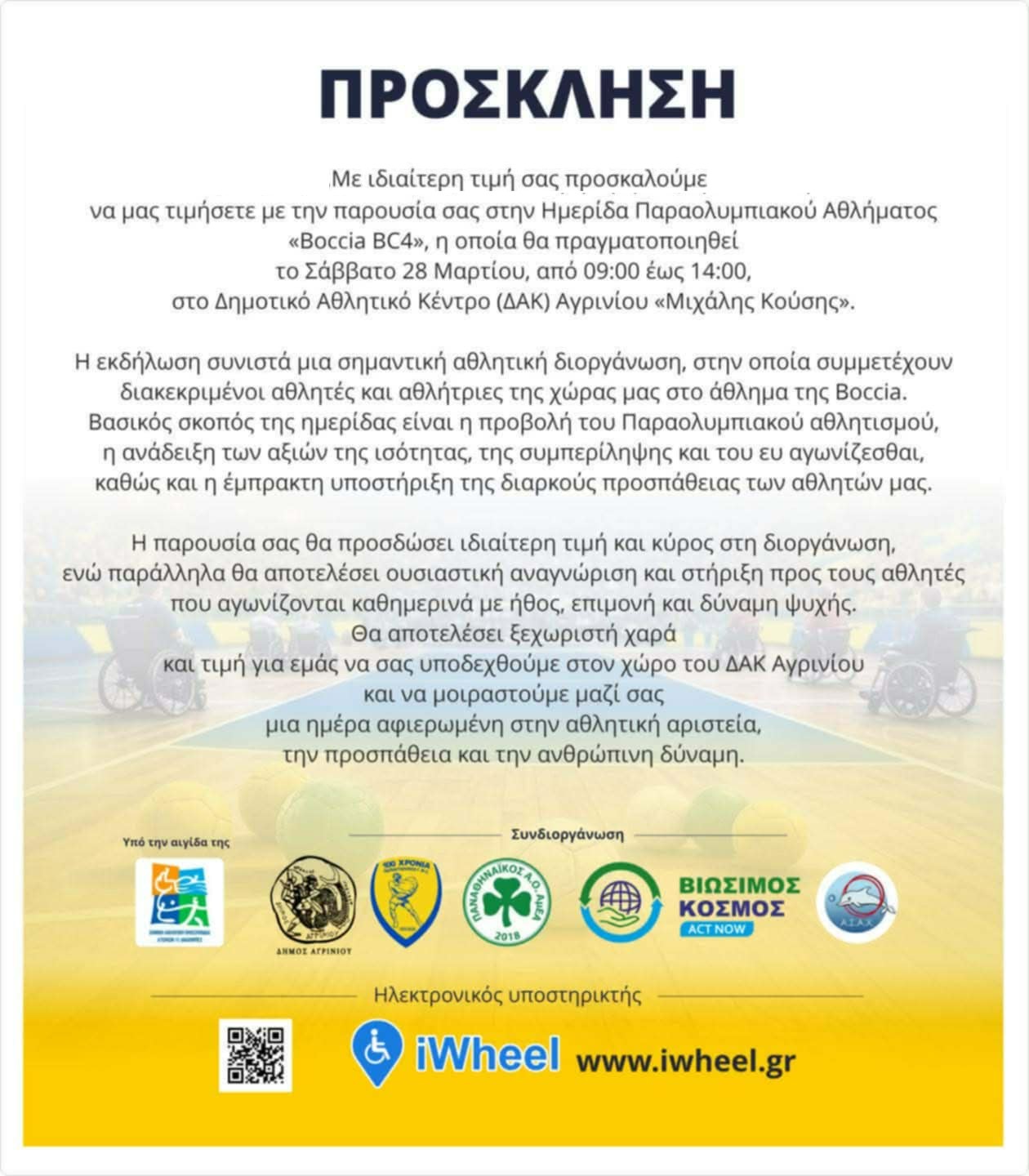 Με ιδιαίτερη τιμή σας προσκαλούμε να μας τιμήσετε με την παρουσία σας στην Ημερίδα Παραολυμπιακού Αθλήματος «Boccia BC4», η οποία θα πραγματοποιηθεί το Σάββατο 28 Μαρτίου, από 09:00 έως 14:00, στο Δημοτικό Αθλητικό Κέντρο (ΔΑΚ) Αγρινίου «Μιχάλης Κούσης».